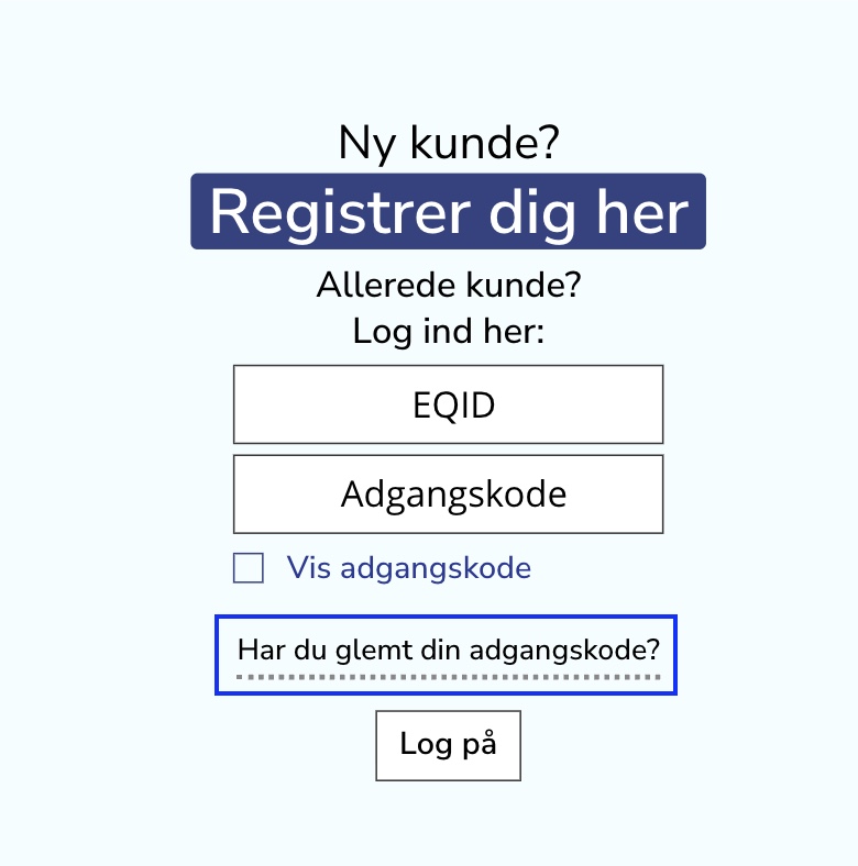 Hvis du har glemt din adgangskode og ikke kan logge ind, skal du klikke på HAR DU GLEMT DIN ADGANGSKODE under LOG IND - ALLEREDE KUNDE - LOG IND HER: