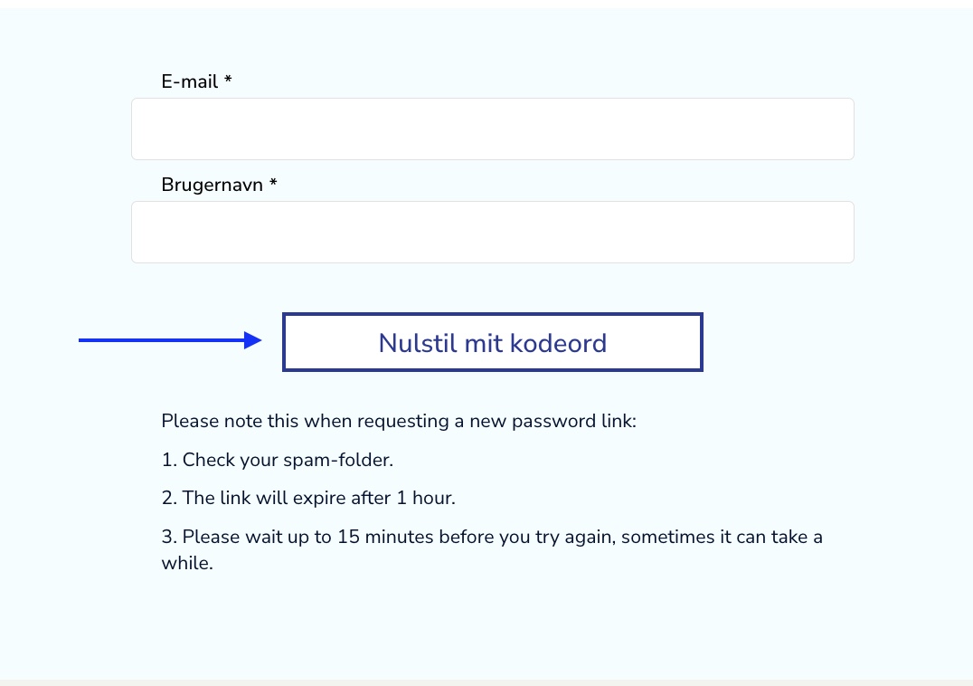 Bemærk: Nulstillingslinket er gyldigt i 1 time, derefter udløber det, og du skal gentage processen. Hvis du ikke har modtaget nulstillingslinket inden for maksimum 15 minutter, tjek din uønsket post samt SPAM filter i din e-mailindbakke. Ellers er du nødsaget til at kontakte vores supportteam. Se venligst under MENU - KONTAKT OS.
