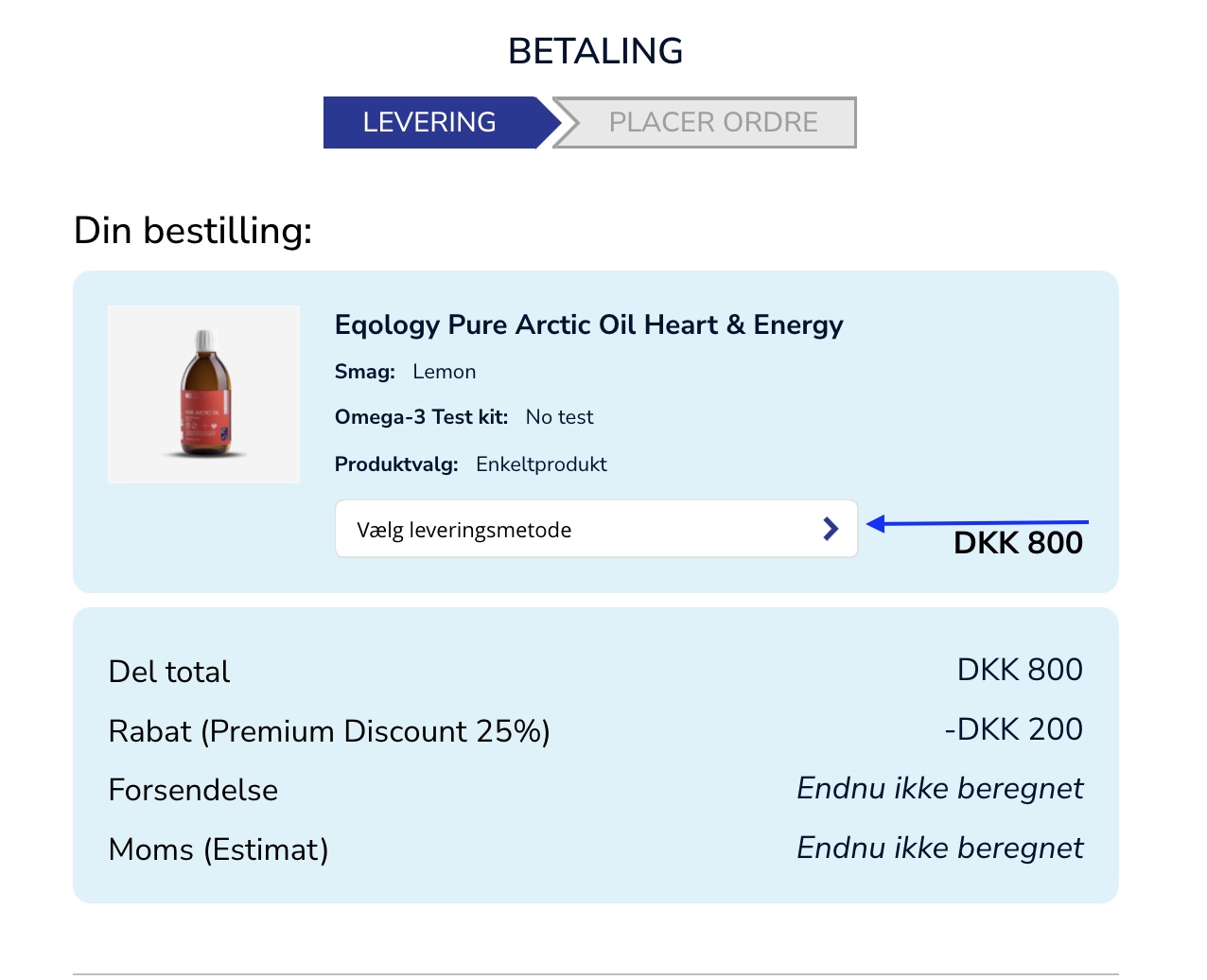 Når du ønsker at færdiggøre din ordre, skal du vælge leveringsmuligheden og klikke på VÆLG LEVERINGSMETODE.