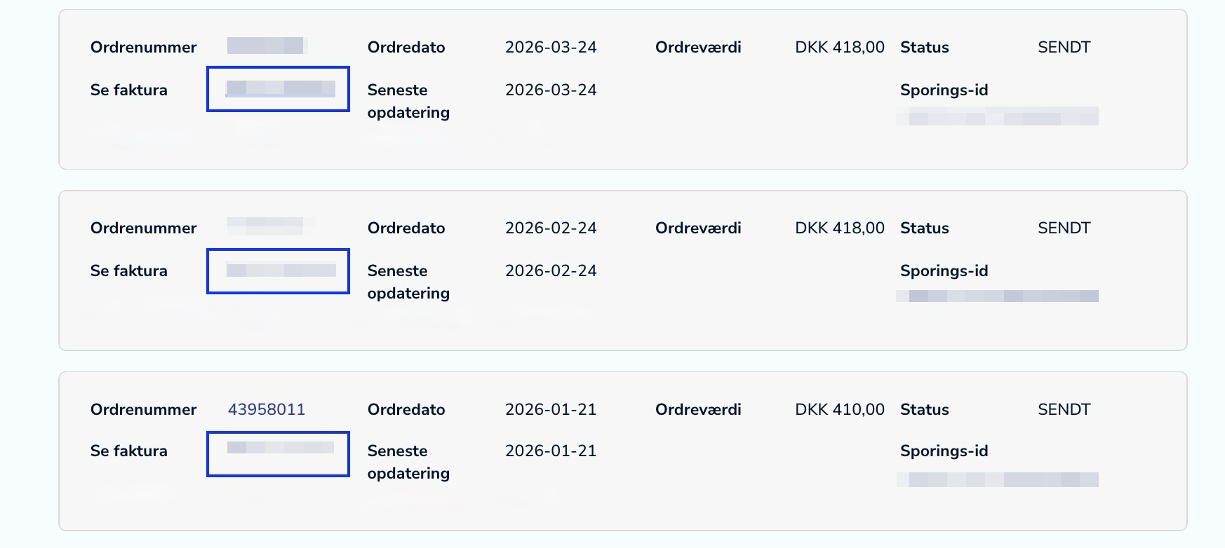 Find den ordre, du ønsker at få fakturaen fra, og klik derefter på SE FAKTURA.