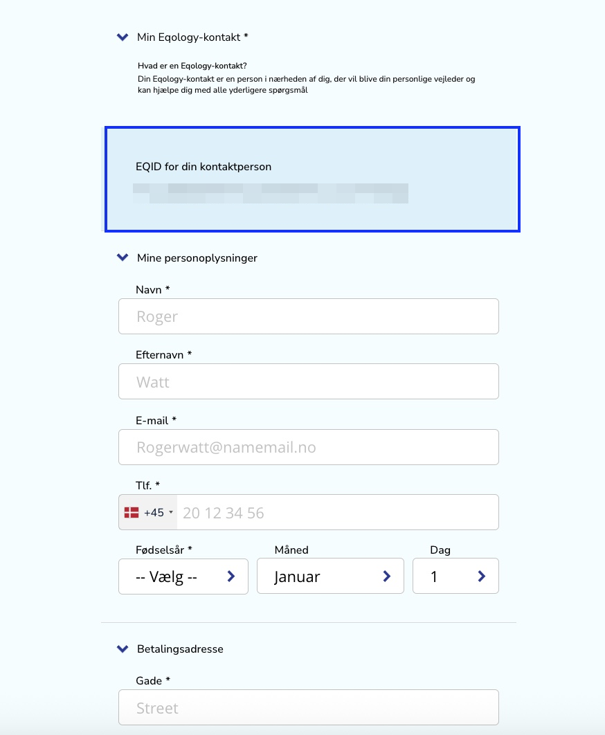 Bemærk: I det blå felt ser du dit navn og dit eget EQ ID- nummer. Hvis du ser en anden persons EQ ID-nummer her, prøv at logge ud og logge ind igen. Det er vigtigt, at du kan se dine oplysninger, så den nye konto vil blive knyttet til din profil.