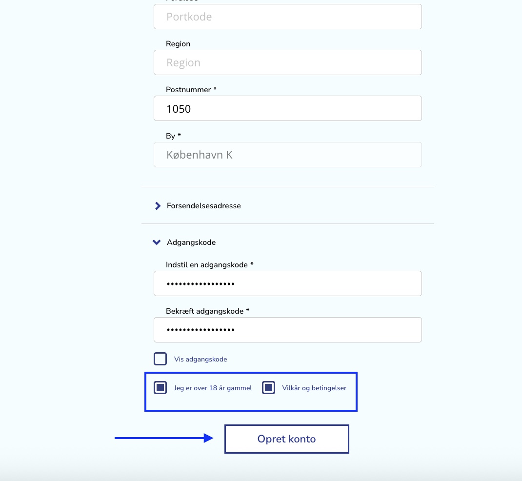 Når du har udfyldt alle felterne, skal du huske at markere JEG ER OVER 18 ÅR GAMMEL samt feltet VILKÅR OG BETINGELSER. Til sidst, klik på OPRET KONTO.