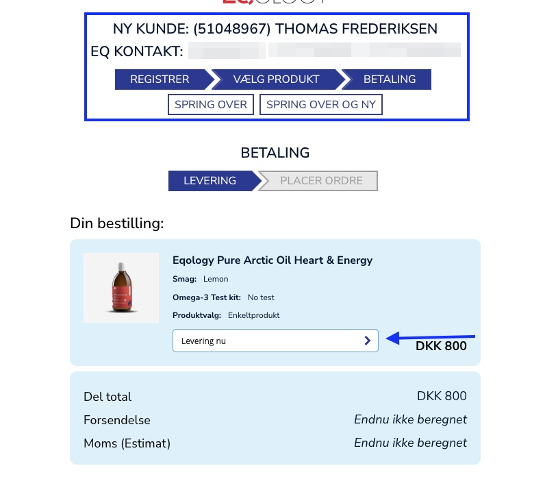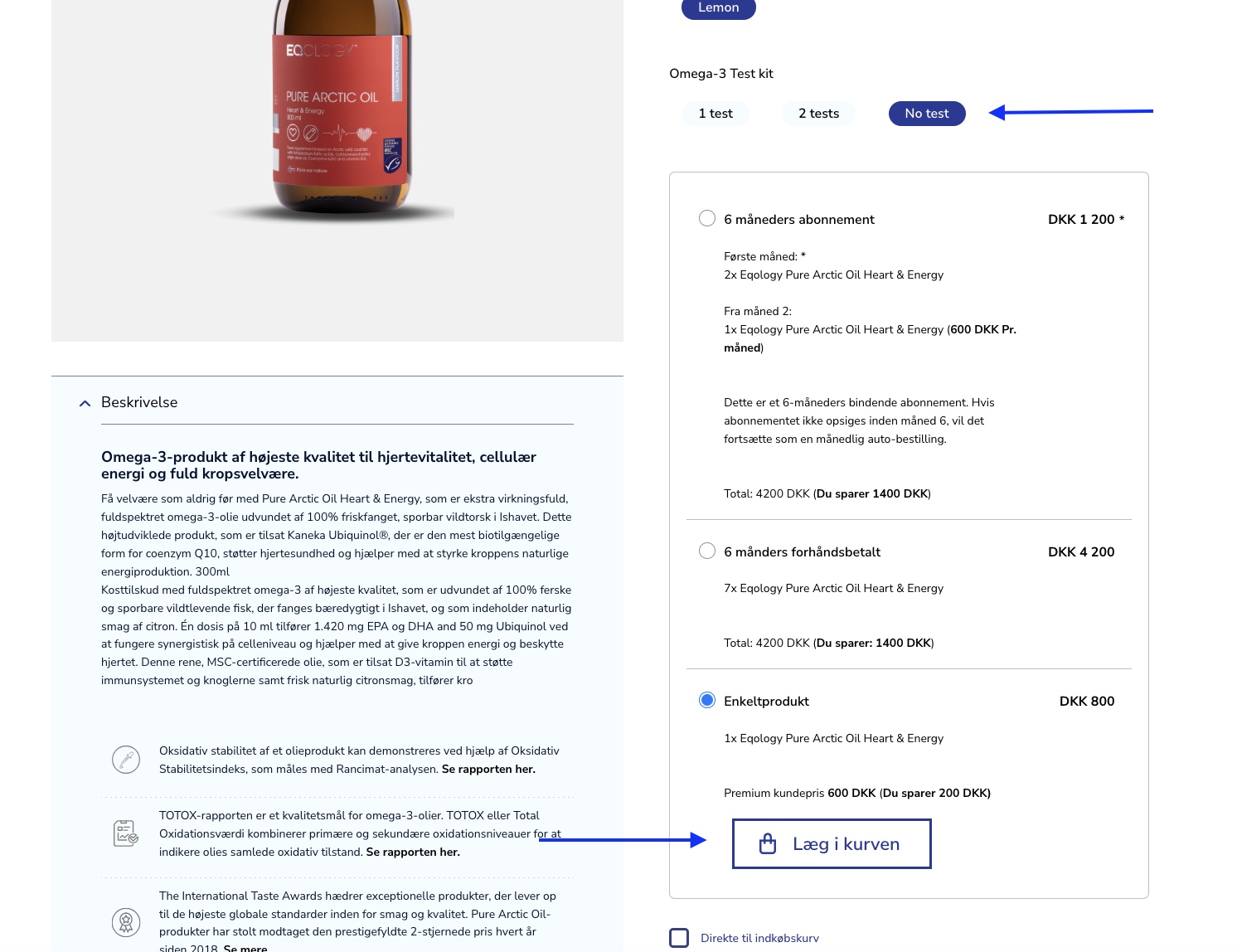 Lad os sige, at din ven ønsker at bestille en flaske Eqology Pure Arctic Oil Heart & Energy for at prøve den som enkeltprodukt. Klik på produktets billede, vælg muligheden NO TEST og vælg et enkeltprodukt. Rul derefter ned på skærmen og klik på LÆG I KURVEN.