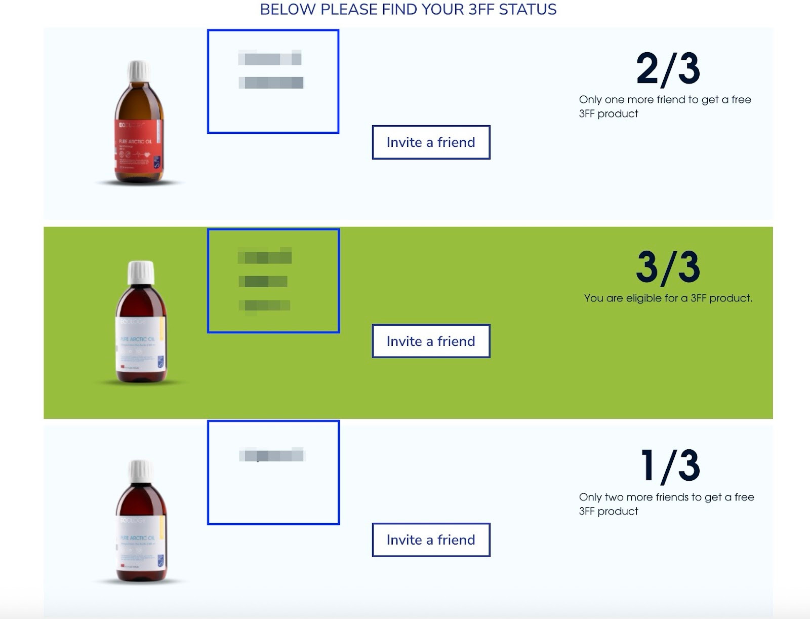 3FF kører på månedsbasis. Det er vigtigt at understrege, at ved at aktivere dit produkt og få 3 kunder med det samme produkt i samme kalendermåned, vil du modtage din 3FF-belønning fra næste måned. For eksempel, hvis du køber en flaske Pure Arctic Oil i januar, og dine 3 kunder gør det samme også i januar, vil du modtage din flaske gratis i februar, og du vil modtage den gratis, så længe dine kunder forbliver aktive på månedlig basis.