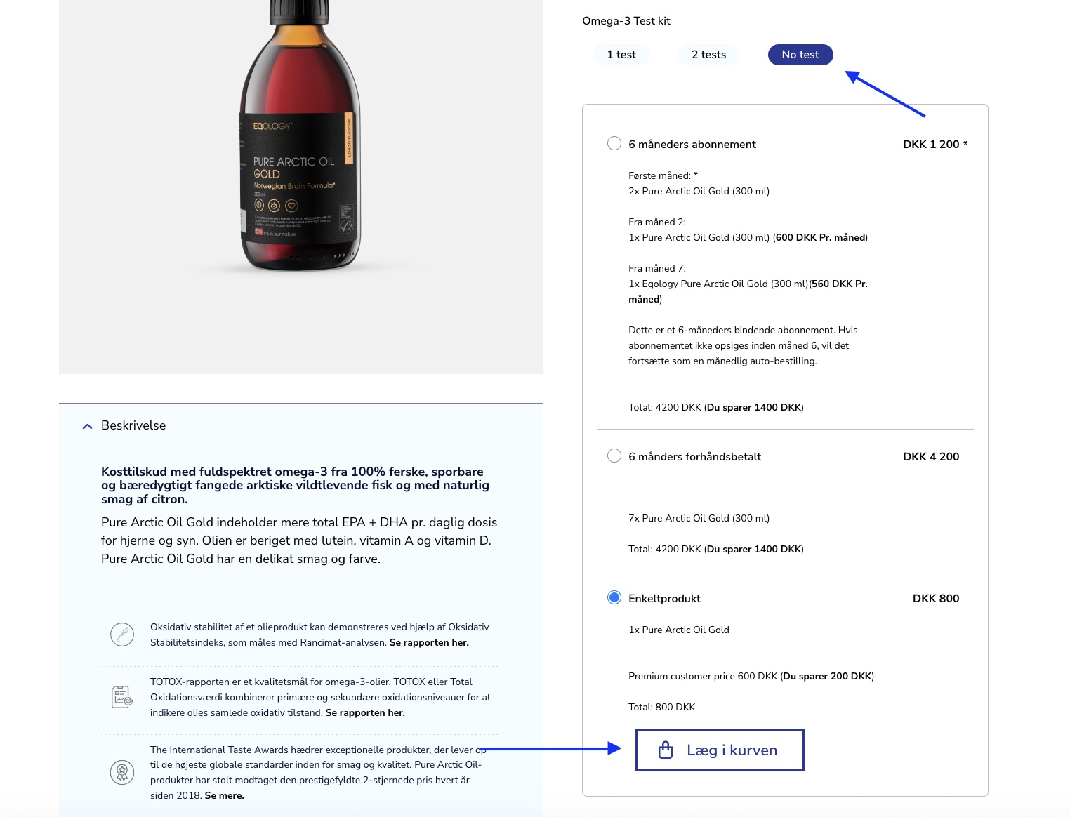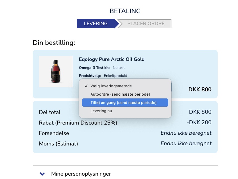 Hvis du ønsker at bestille et ekstra produkt eller flere produkter og få dem sendt med din næste månedlige levering, kan du tilføje disse varer som enkeltprodukter til din autoordre. Hermed bliver de kun sendt én gang. Husk at vælge muligheden NO TEST; først derefter vil muligheden for et enkeltprodukt være synligt.