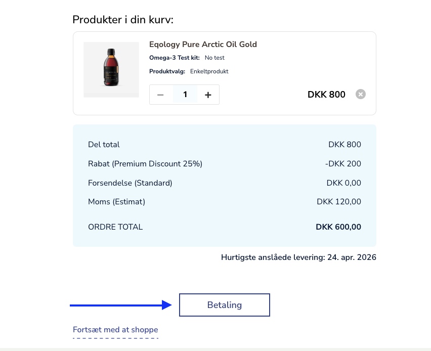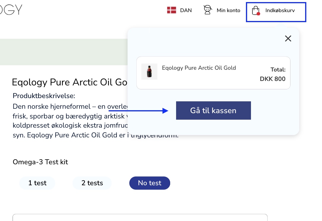 Her kan du angive det antal af produktet, du ønsker at bestille, og derefter klikke på GÅ TIL KASSEN.