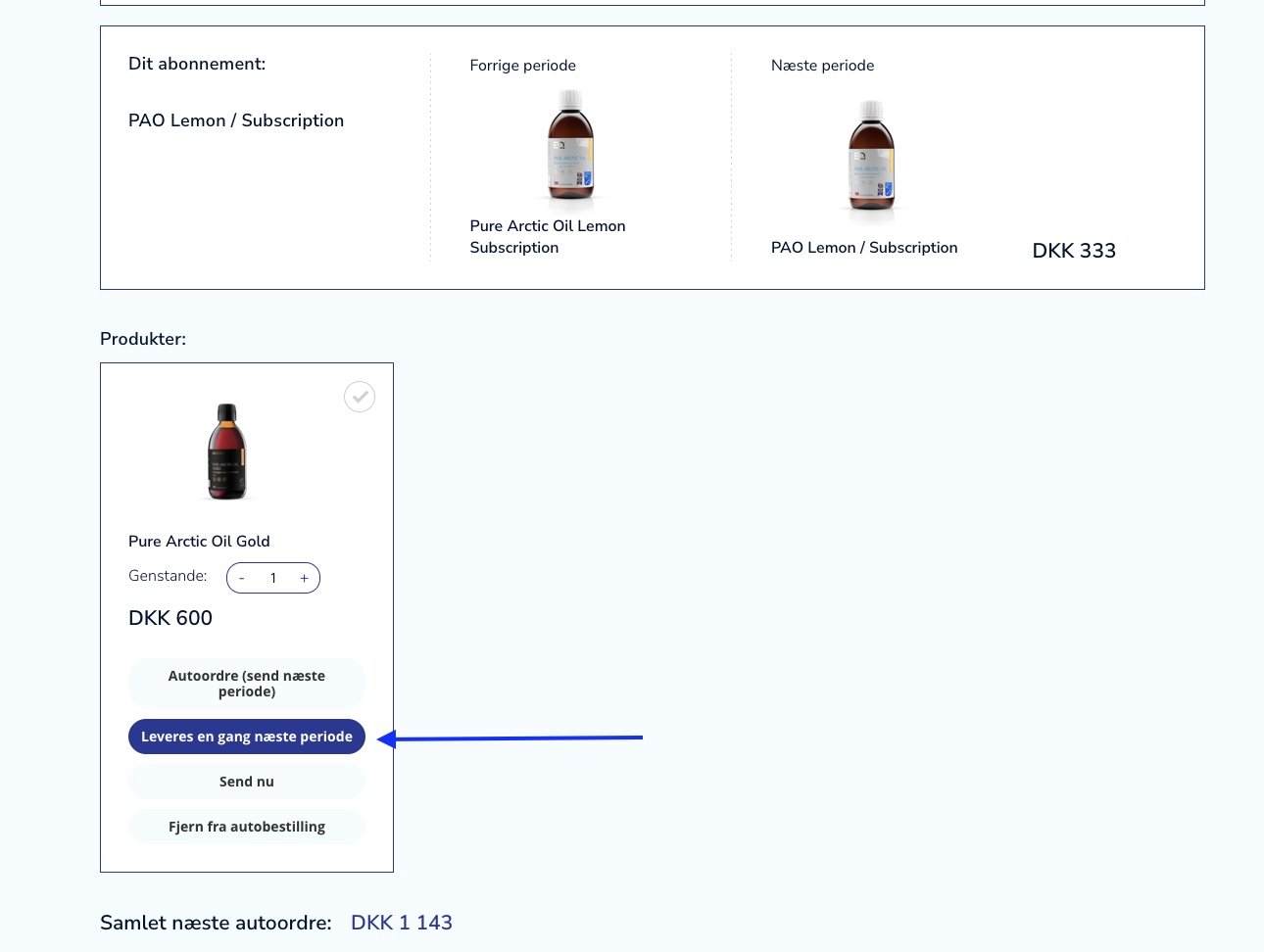 Her kan du se indholdet af din månedlige ordre. Som du kan se under fanen abonnement, er der et enkeltprodukt Pure Arctic Oil Gold, som vil blive sendt med næste levering.