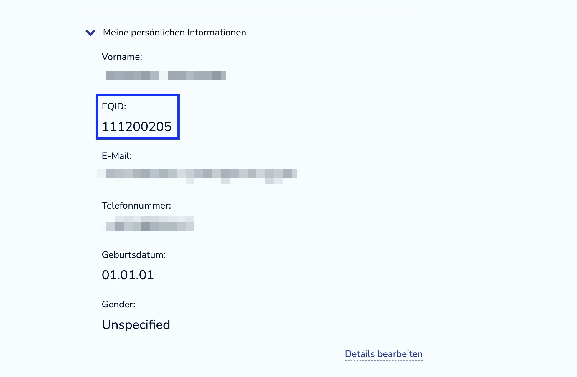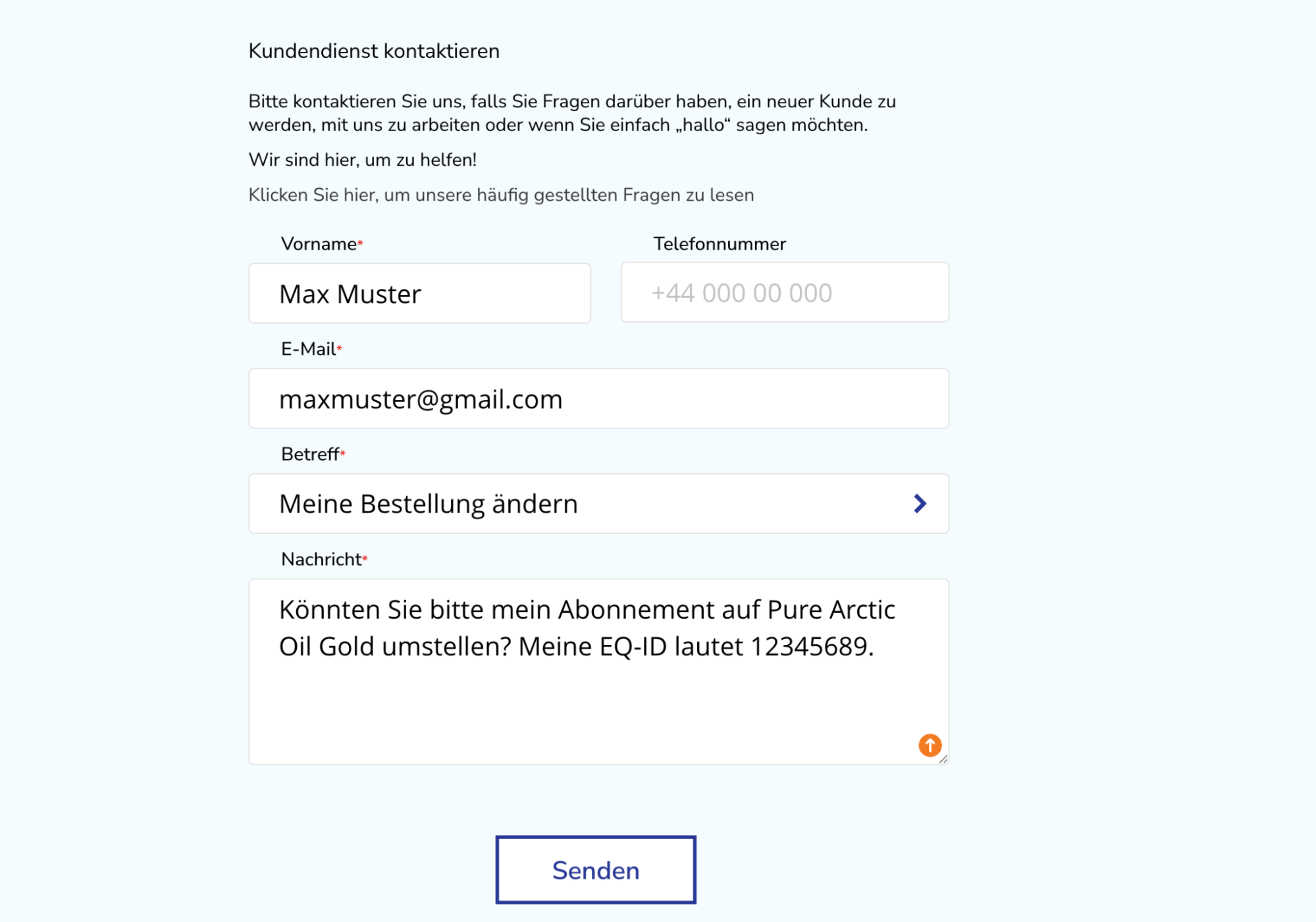 Denken Sie daran, in Ihrer E-Mail immer Ihre EQ-ID-Nummer anzugeben. Das spart uns viel Zeit und Arbeit, da wir so direkt auf Ihr Konto zugreifen können. Sie finden Ihre EQ-ID-Nummer in einer der E-Mails, die Sie von uns erhalten haben, oder in Ihrem Konto unter „Kontoinformationen“.