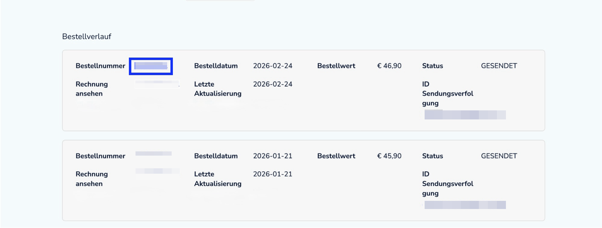 Falls relevant, können Sie auch Ihre Bestellnummer angeben, falls Sie die Bestellung ändern oder eine Anfrage dazu stellen möchten. Gehen Sie dazu erneut zu „Mein Konto“ und „Meine Bestellungen“.