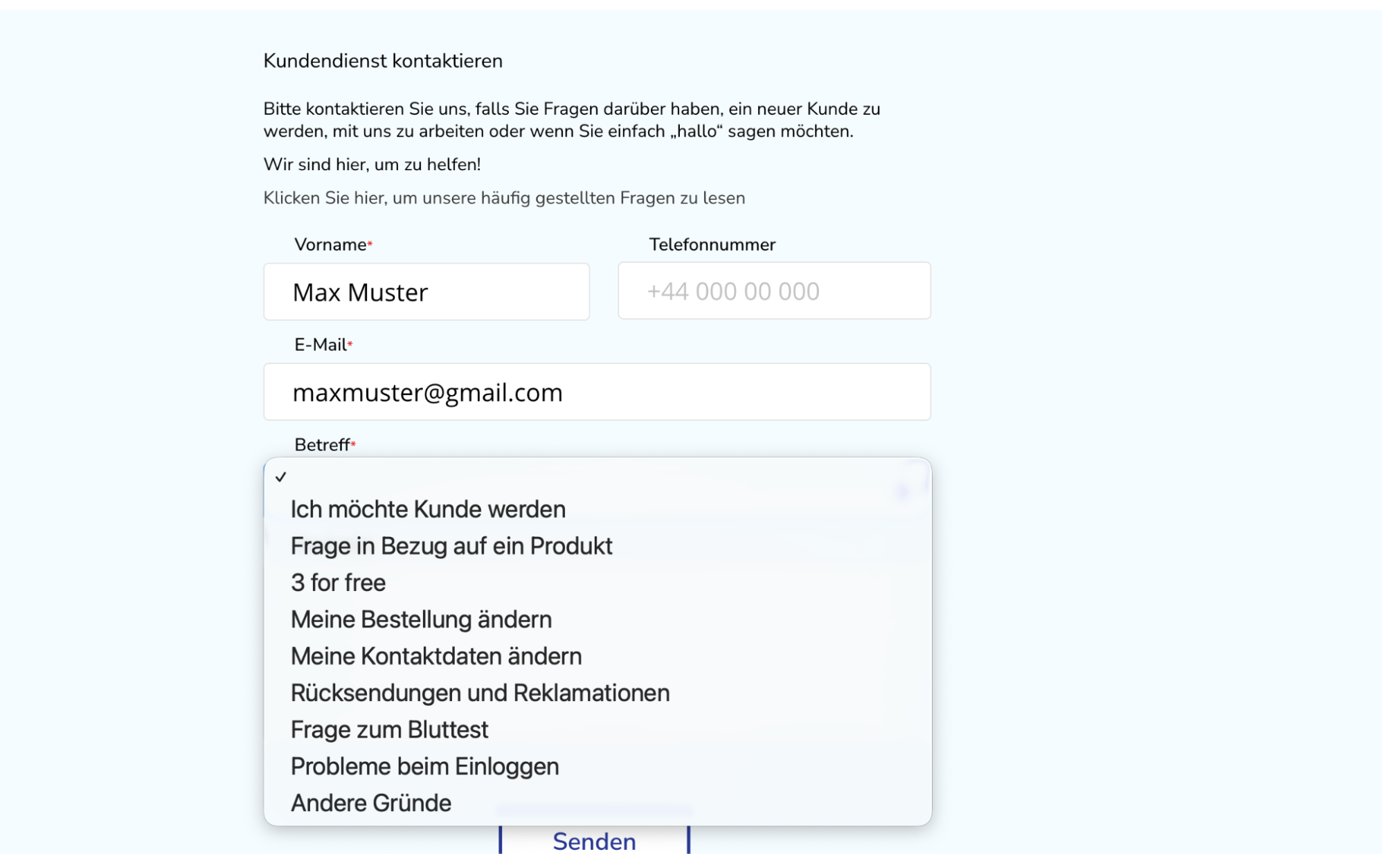 Hier finden Sie ein Formular, das Sie ausfüllen und absenden können, um Ihre Frage zu stellen. Im Betreff-Feld finden Sie die beliebtesten Fragenkategorien, aus denen Sie auswählen können.