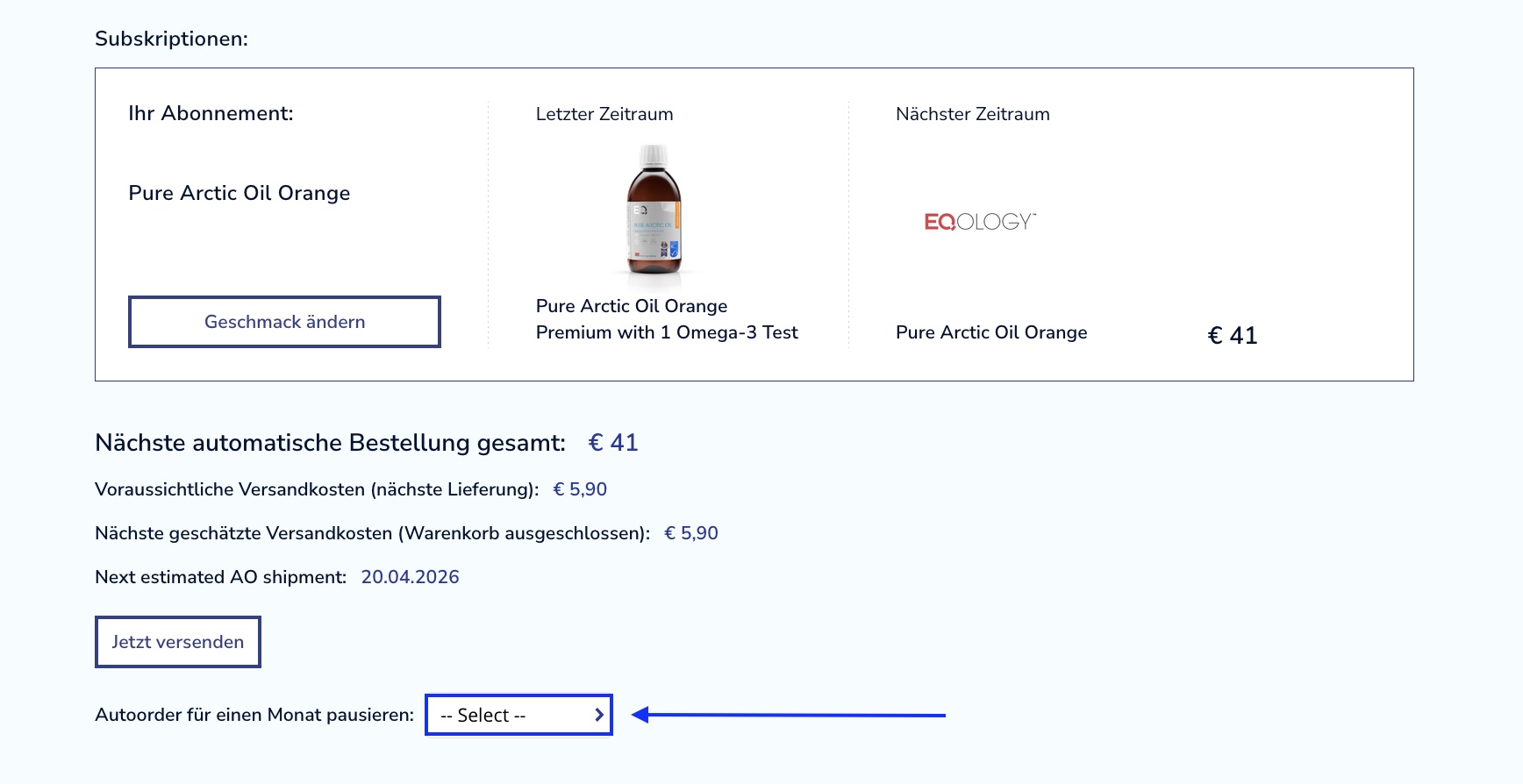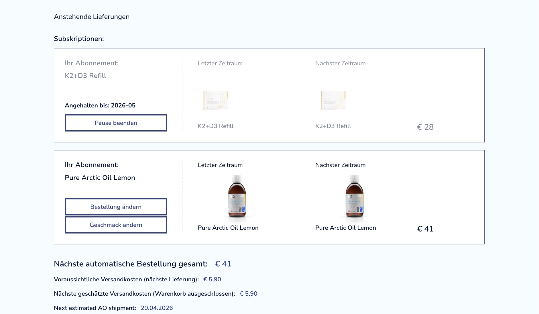 Wie Sie sehen können, wird das Diagramm für K2+D3 ausgegraut und Sie erhalten eine Bestätigung, dass das Produkt pausiert wurde. Das Diagramm für Pure Arctic Oil ist weiterhin aktiv, was bedeutet, dass Sie in den kommenden zwei Monaten ausschließlich Fischöl erhalten werden.