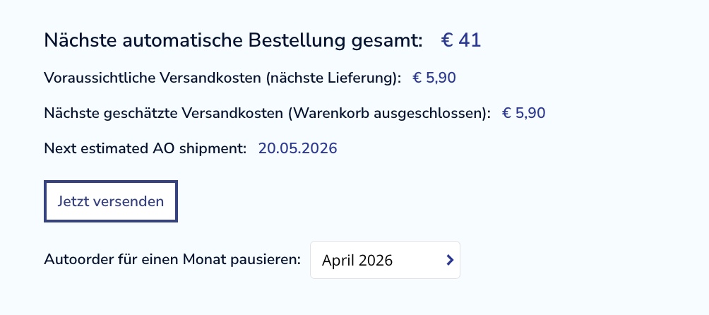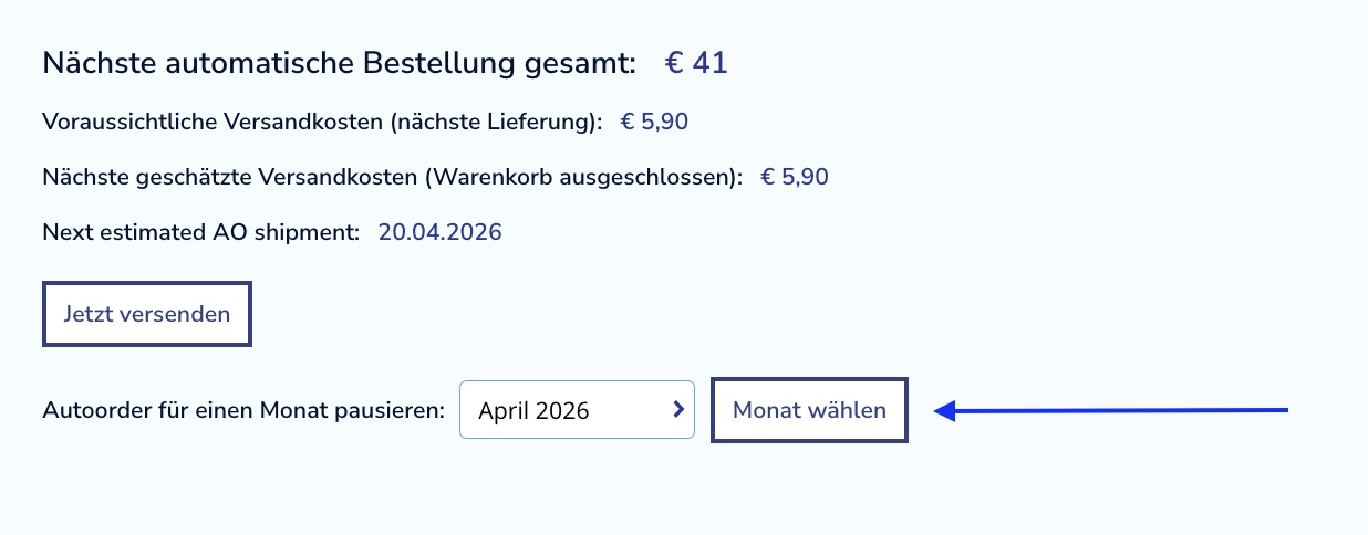 Sie können Ihr Abonnement einmal pro Jahr über Ihr Konto selbst pausieren. Gehen Sie dazu auf „Mein Konto“ und dann auf „Meine Bestellungen“.