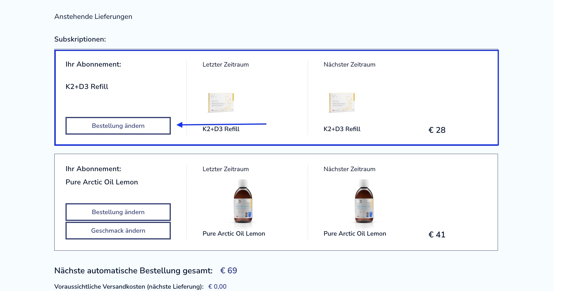 Angenommen, Sie möchten Ihr Abonnement für K2+D3 für zwei Monate unterbrechen. Klicken Sie einfach auf die Schaltfläche „Bestellung ändern“ in der K2+D3-Abonnementübersicht.