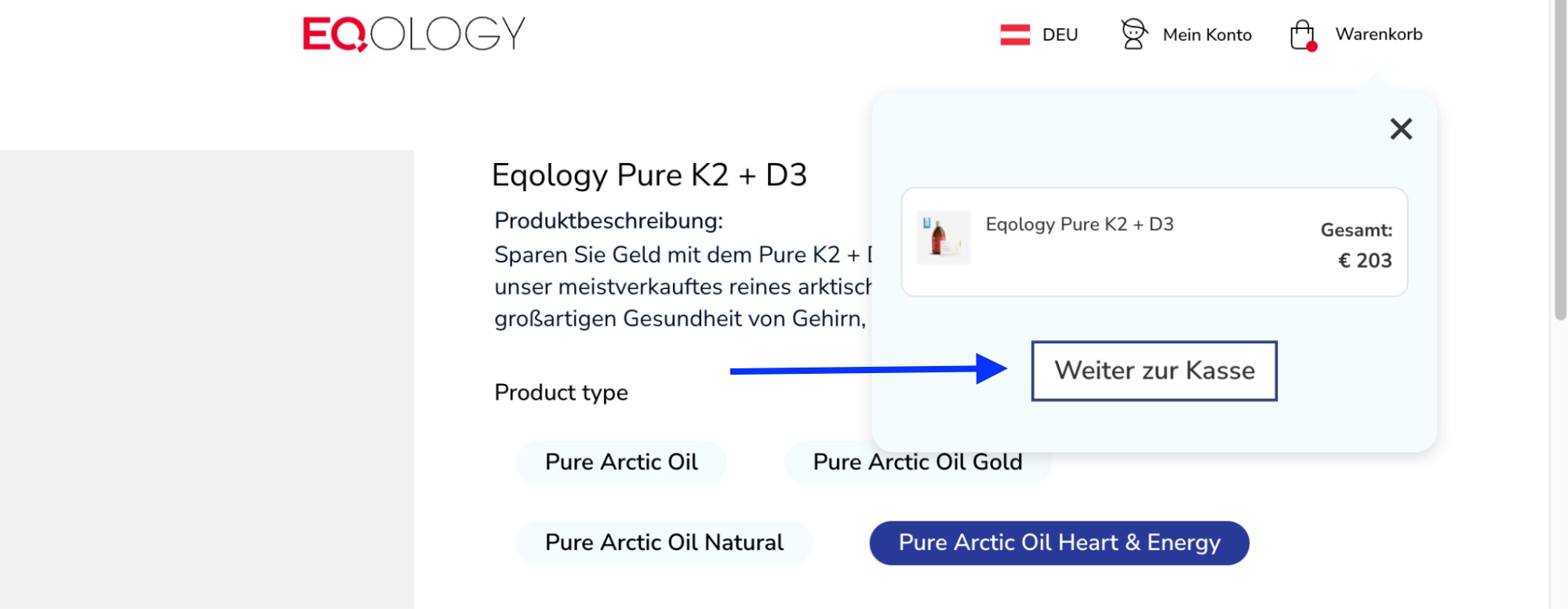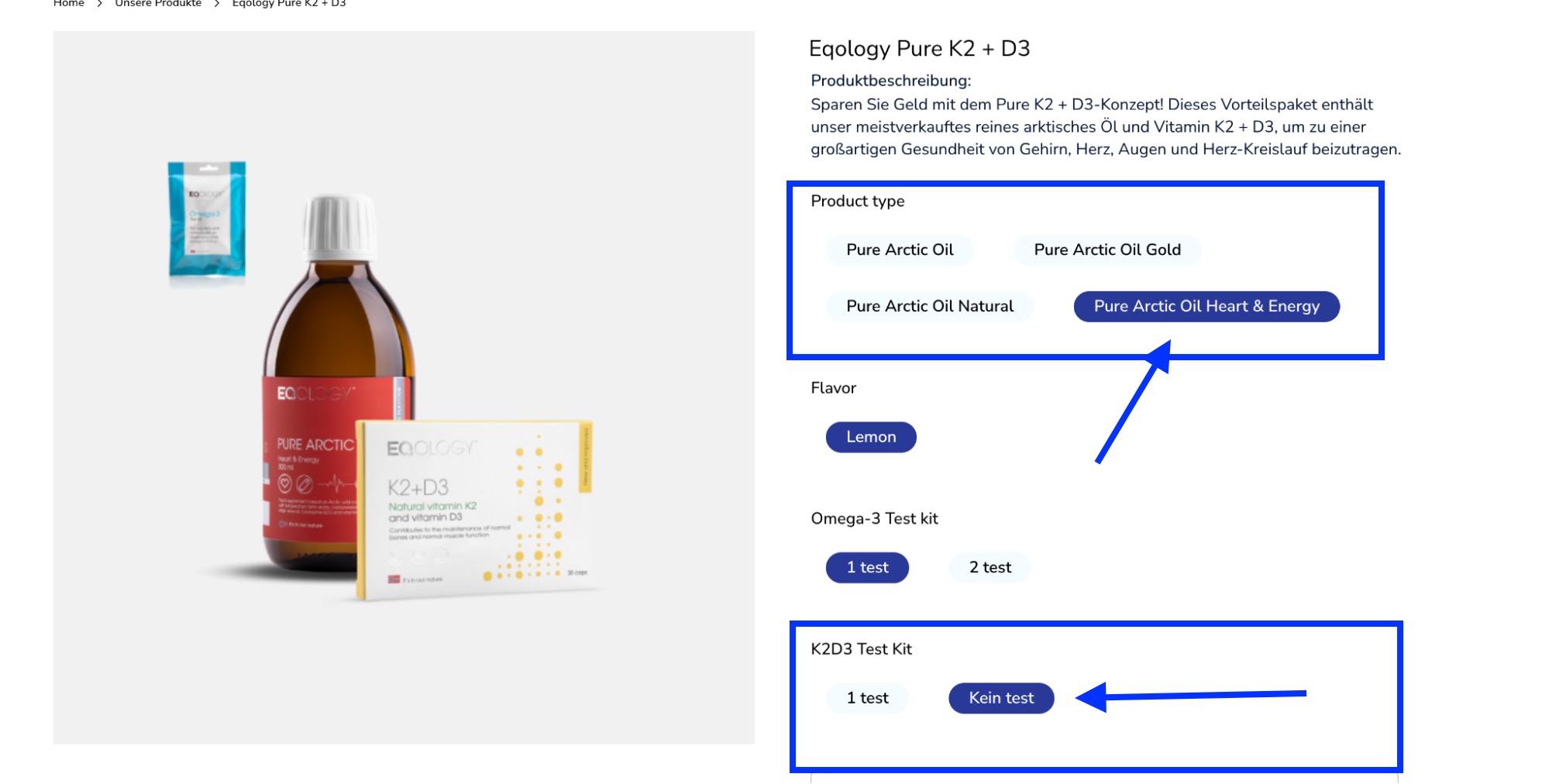 Klicken Sie zunächst unter „Produkttyp“ auf „Pure Arctic Oil Heart&Energy“. Navigieren Sie dann zum K2+D3-Test und klicken Sie auf „kein Test“.