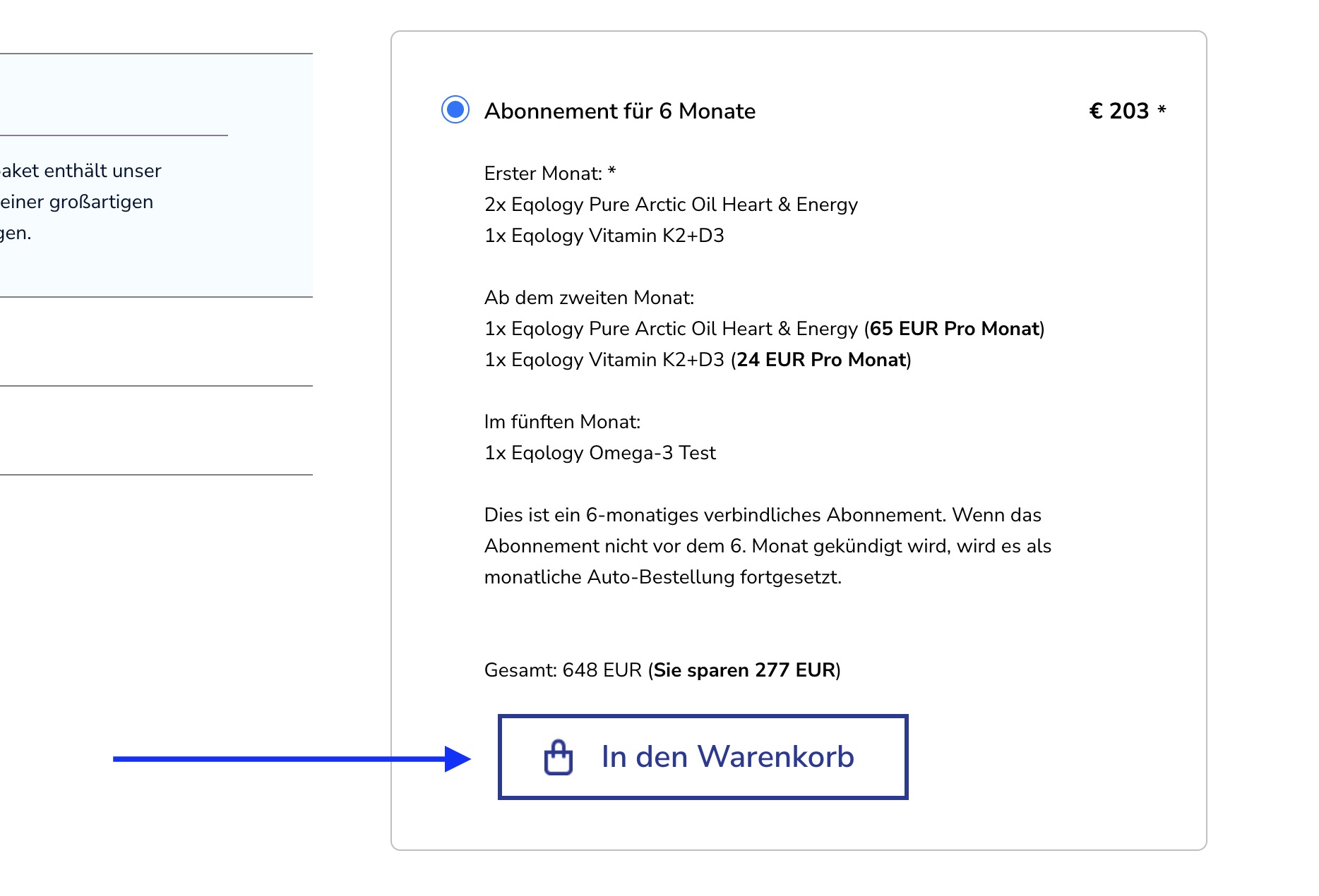 Wie Sie sehen können, wurde auch das Bild des Vorteilspakets geändert. In der Beschreibung des Abonnements sehen Sie außerdem, dass der Preis für K2+D3 bei 24 Euro liegt – das ist ein noch günstigerer Preis pro K2+D3-Paket als beim K2+D3-Monatsabonnement.
