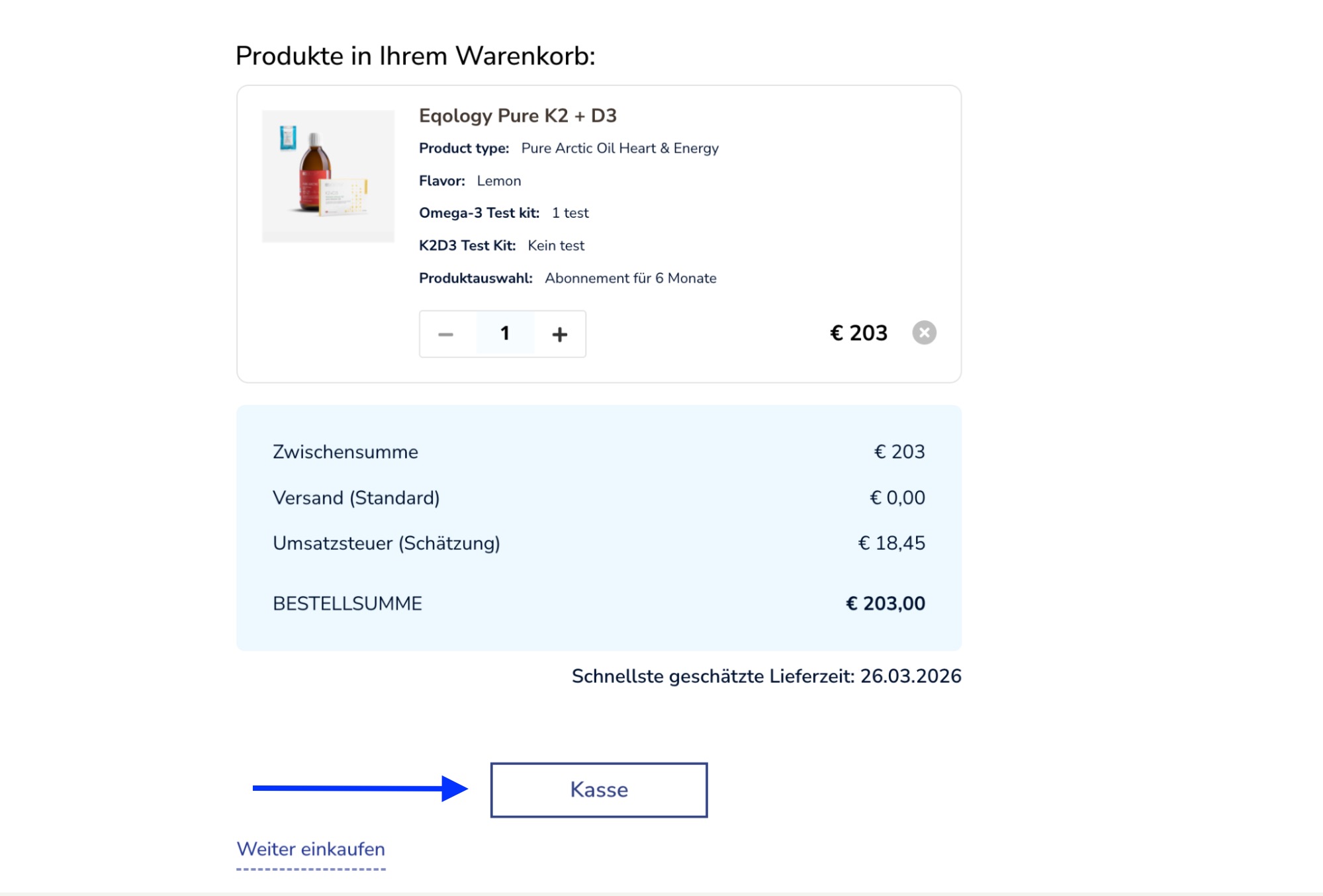 Auf der rechten Seite können Sie zwischen verschiedenen Ölsorten wählen. Auf Wunsch können Sie auch einen K2+D3-Test bestellen. Bestellen wir Pure Arctic Oil Heart and Energy mit Omega-3-Test, aber ohne K2+D3-Test.