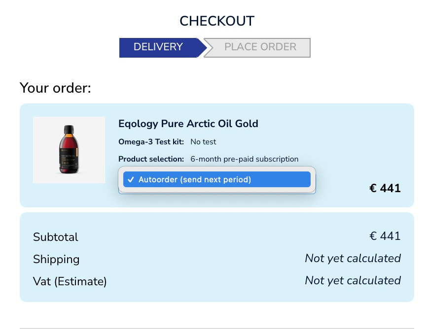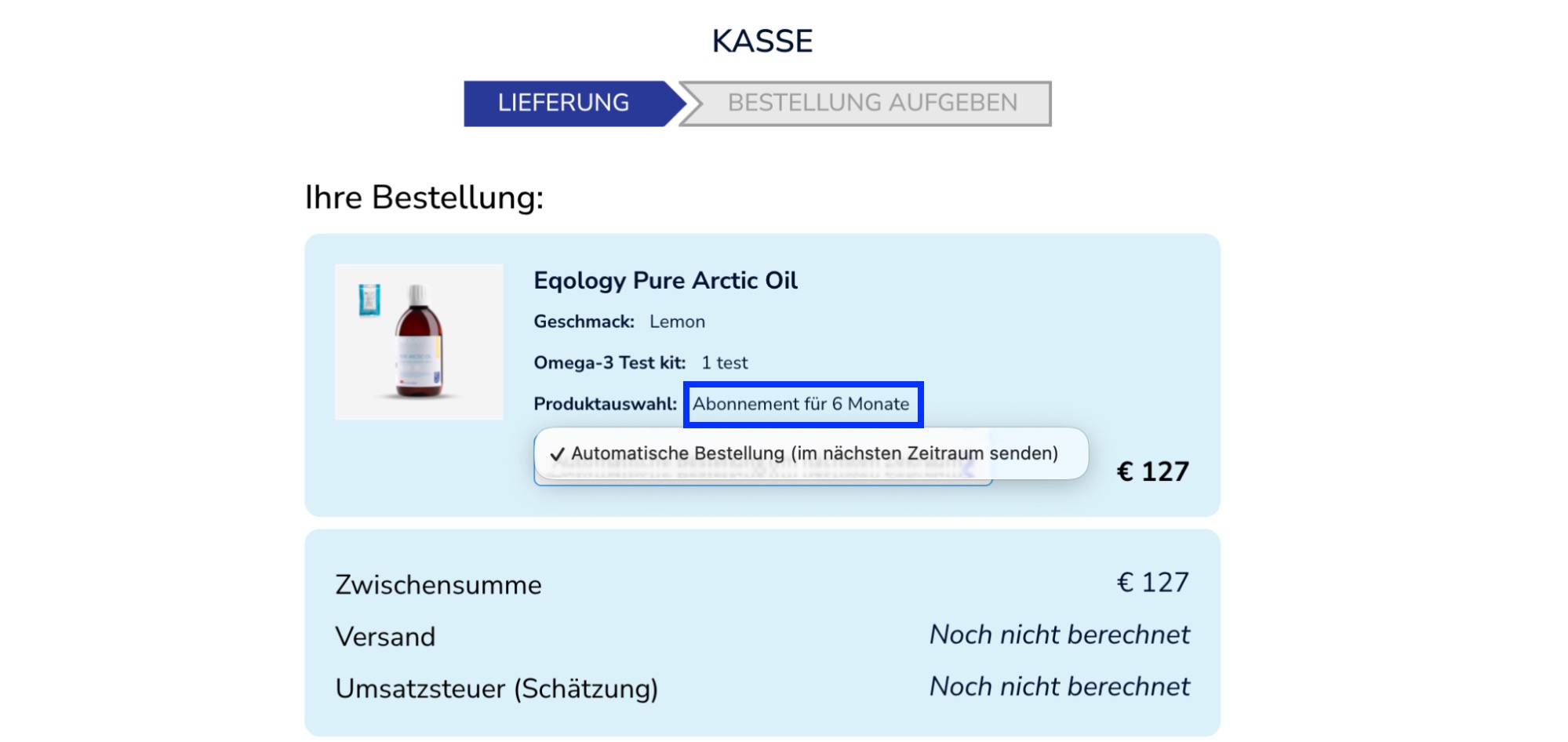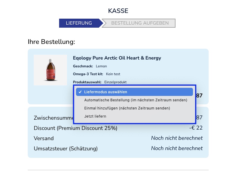 Es wird nur eine Option angezeigt, da es sich um ein Abonnement handelt, erhalten Sie dieses Produkt monatlich. Wenn Sie es schneller erhalten möchten und weitere Produkte in Ihrer automatischen Bestellung haben, erfahren Sie hier, wie das geht (Wie kann ich meine Abobestellung direkt anfordern?)