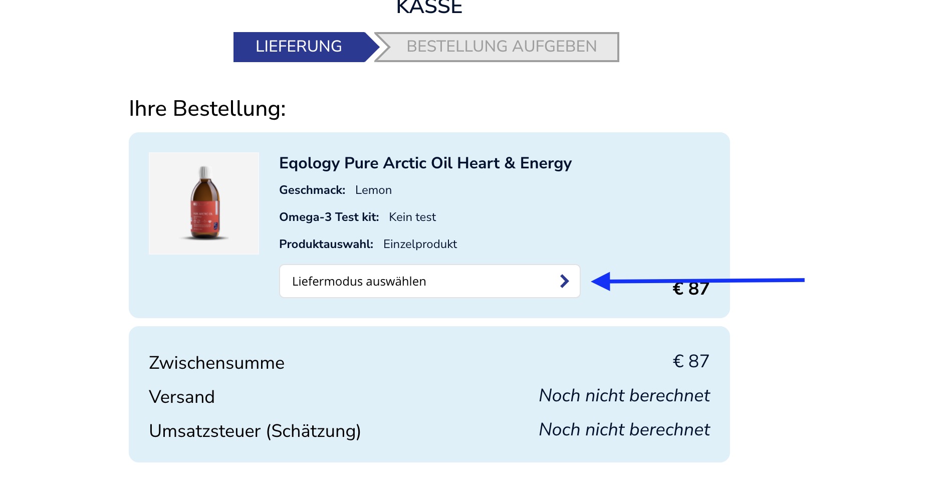 Wenn Sie Ihre Bestellung abschließen möchten, müssen Sie die Lieferoption auswählen. Klicken Sie dazu auf „Liefermodus auswählen“.