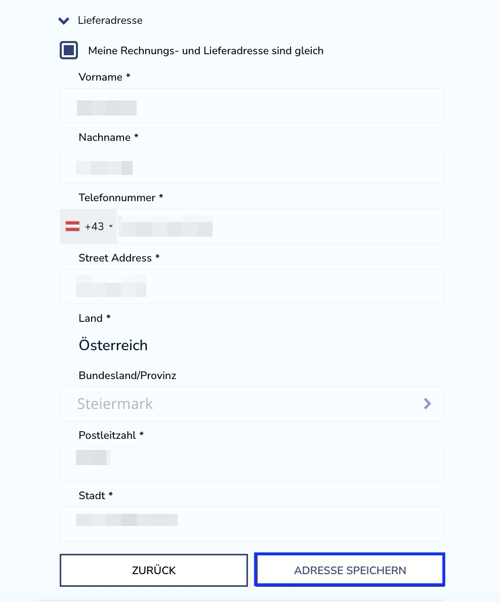 Wenn Ihre Rechnungsadresse mit Ihrer Lieferadresse übereinstimmt, können Sie die erste Option auswählen.