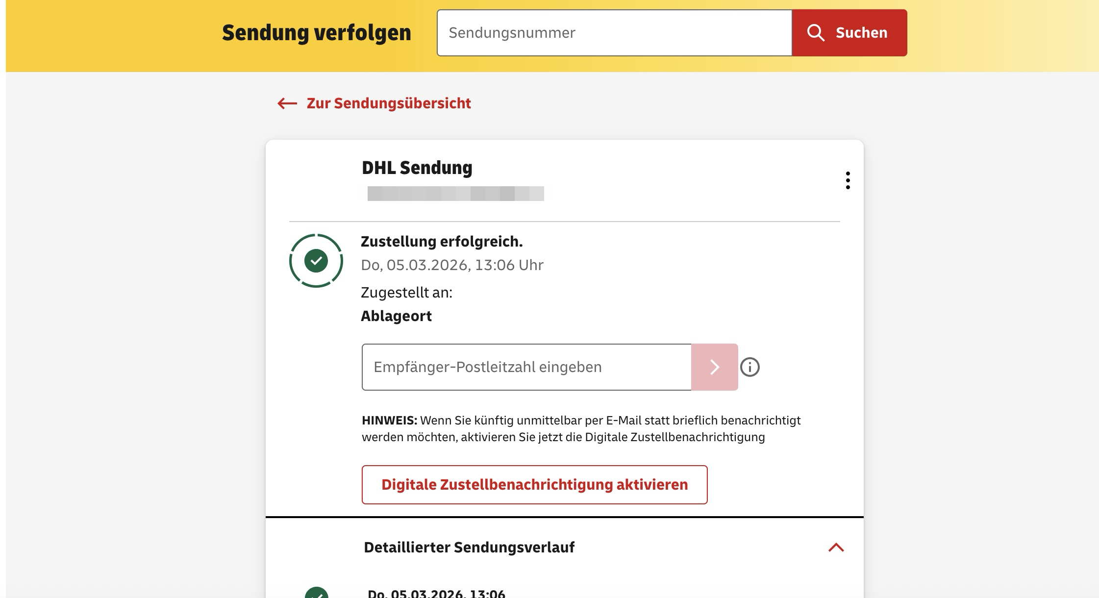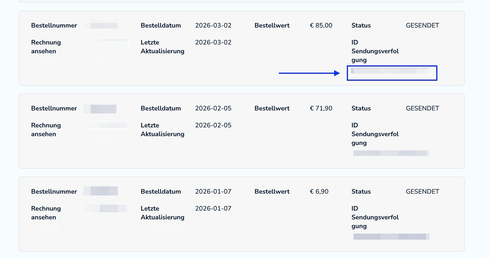 Falls Sie Ihre Sendungsverfolgungs-E-Mail versehentlich gelöscht haben oder nicht erhalten haben, finden Sie diese in Ihrem Konto.