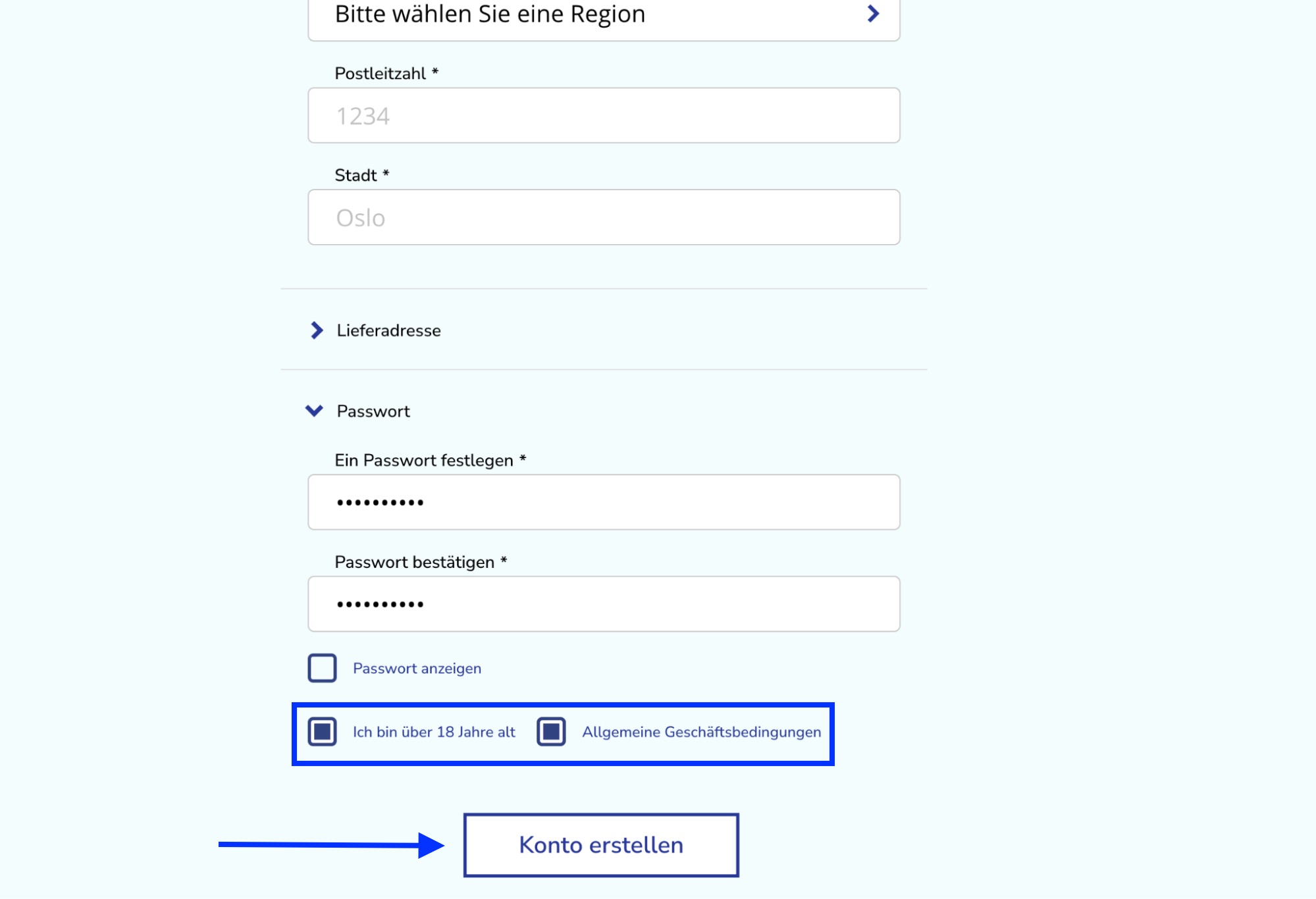 Wenn Sie alle Felder ausgefüllt haben, denken Sie daran, das Kästchen „Ich bin über 18 Jahre alt“ und „Allgemeine Geschäftsbedingungen“ anzukreuzen. Klicken Sie anschließend auf „Konto erstellen“.