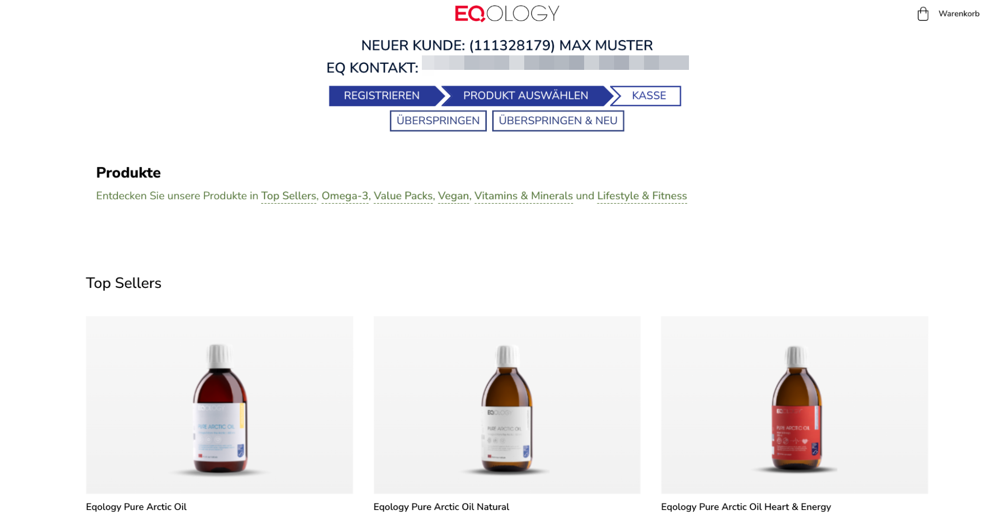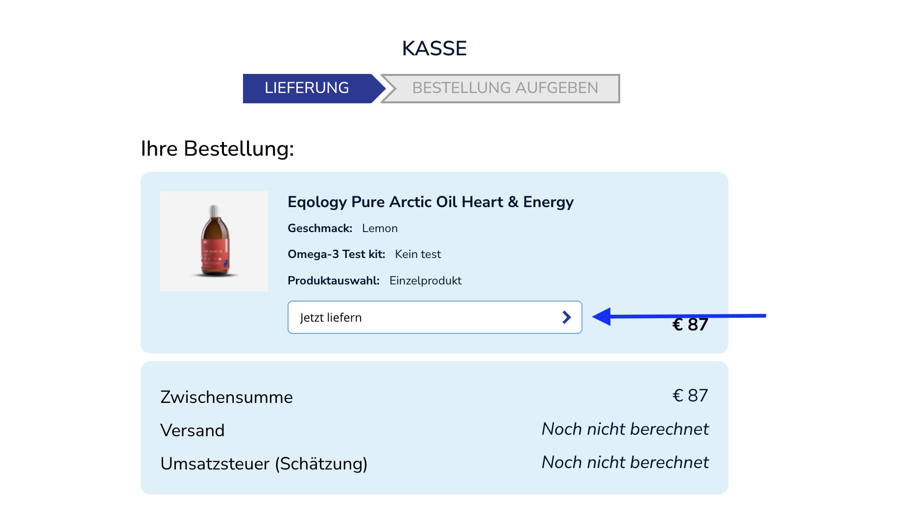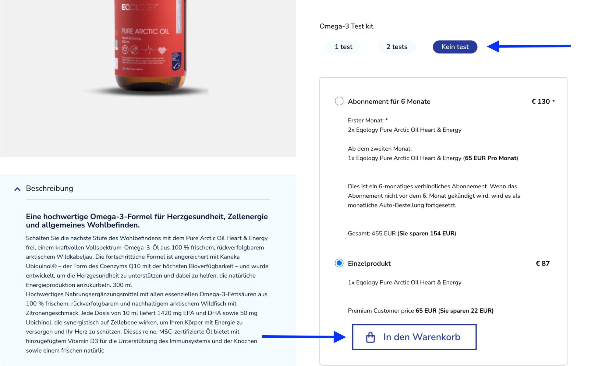 Nehmen wir an, Ihr Freund möchte eine Flasche „Eqology Pure Arctic Oil Heart&Energy“ bestellen, um das Produkt einzeln auszuprobieren. Klicken Sie einfach auf das Produktbild, wählen Sie die Option „Kein Test“ und wählen Sie ein einzelnes Produkt aus. Scrollen Sie dann nach unten und klicken Sie auf „In den Warenkorb“.