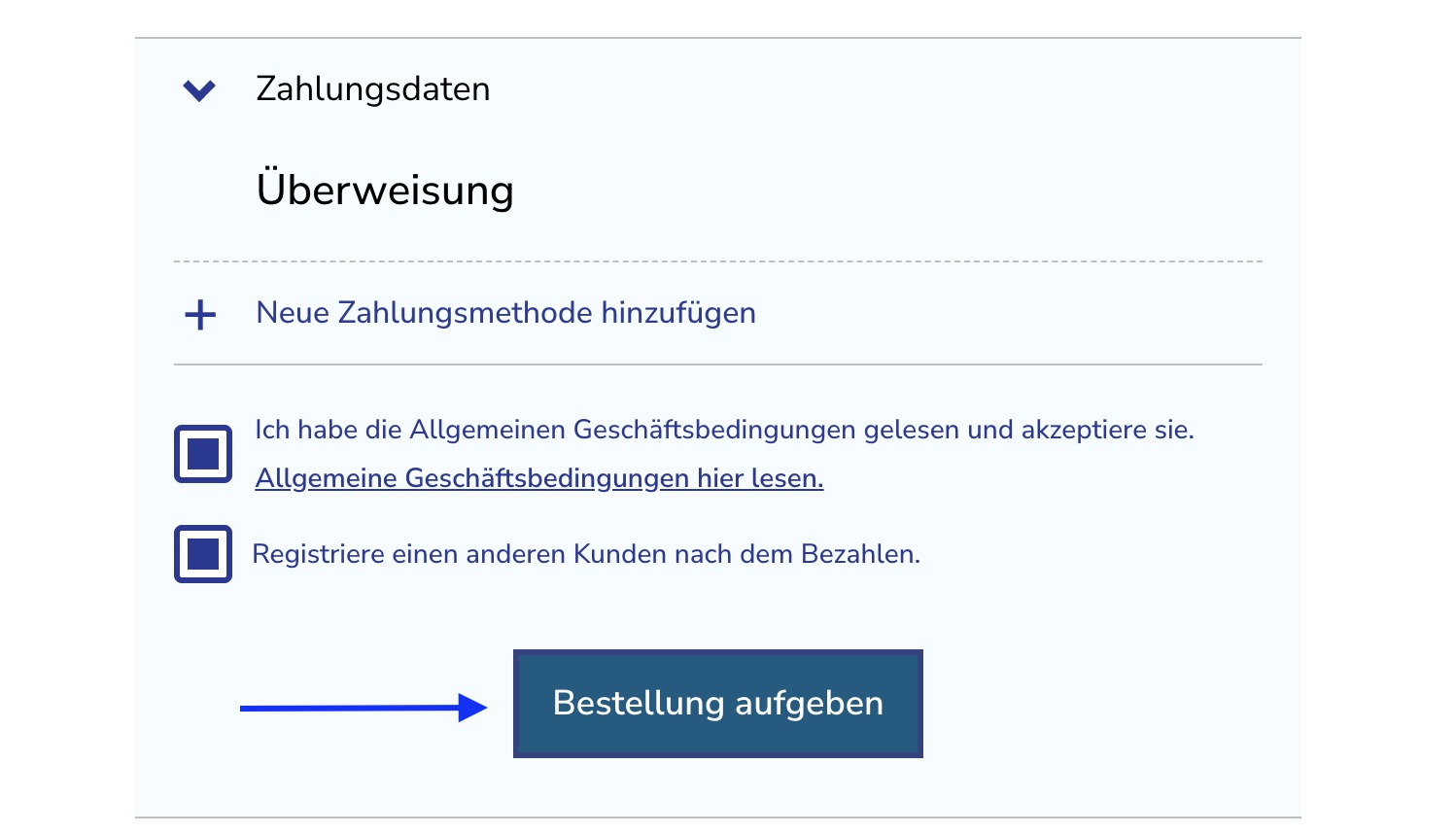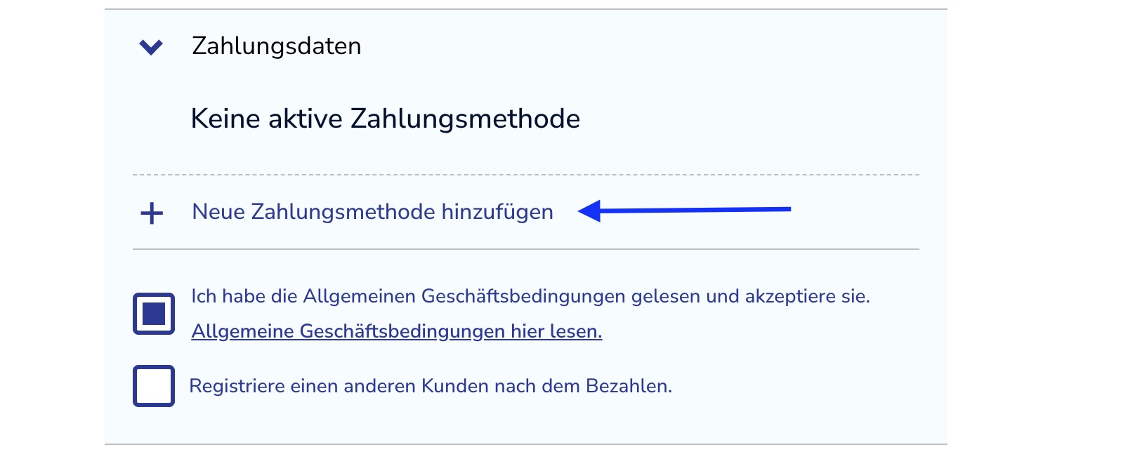 Bitte beachten Sie: Wenn Sie mehrere Kunden gleichzeitig registrieren möchten, aktivieren Sie das Kontrollkästchen „Nach dem Bezahlen weiteren Kunden registrieren“. Sie werden automatisch zu Ihrem Konto und anschließend wieder zum Registrierungsformular weitergeleitet.