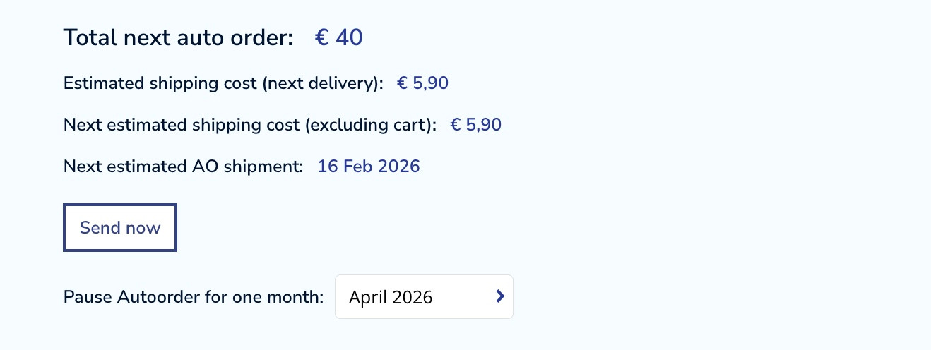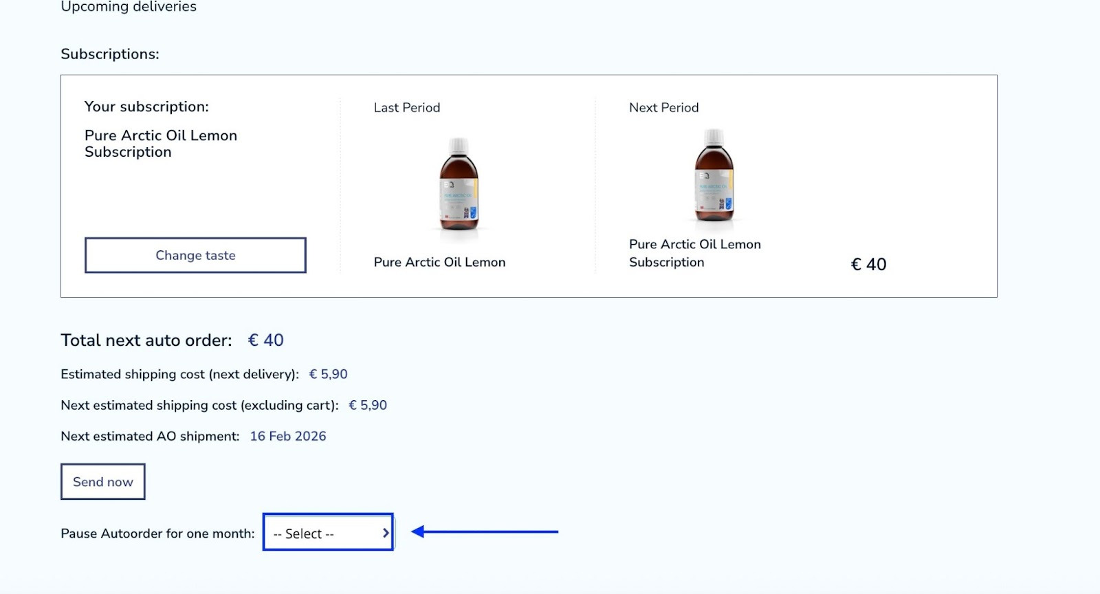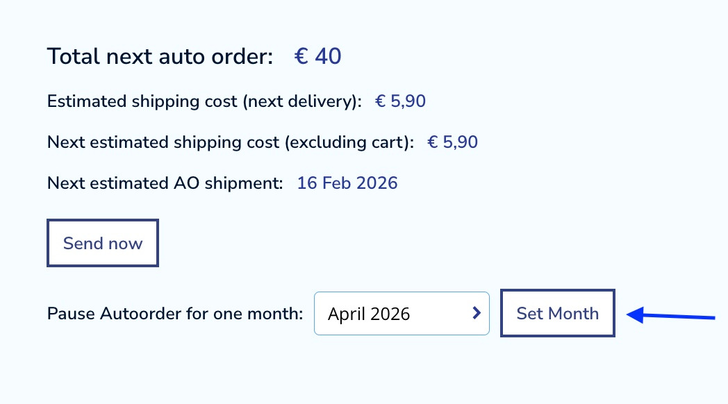 Under your subscription chart there is an option to choose a month when you would like to have your subscription paused. Click on -select and choose the desired month.
