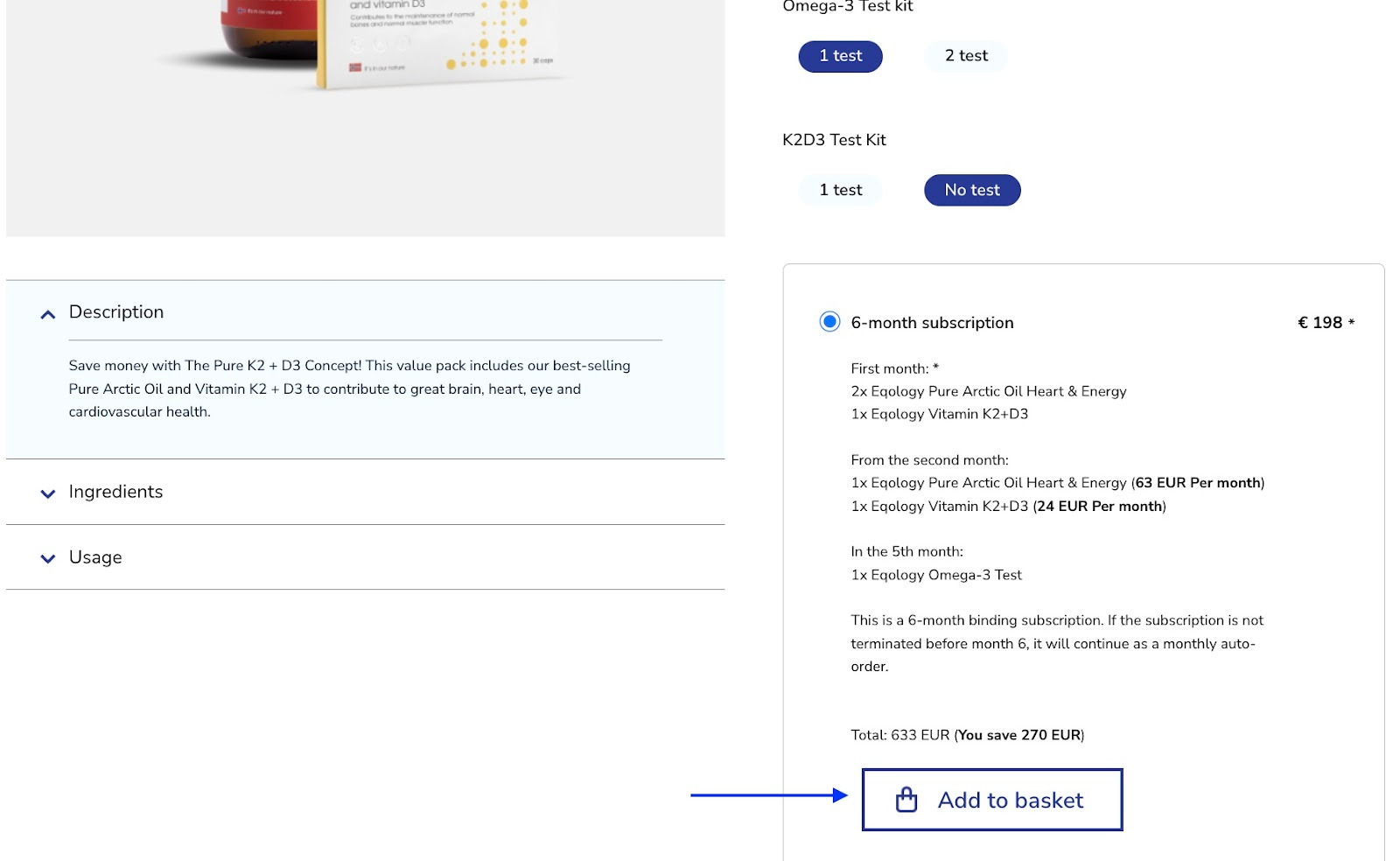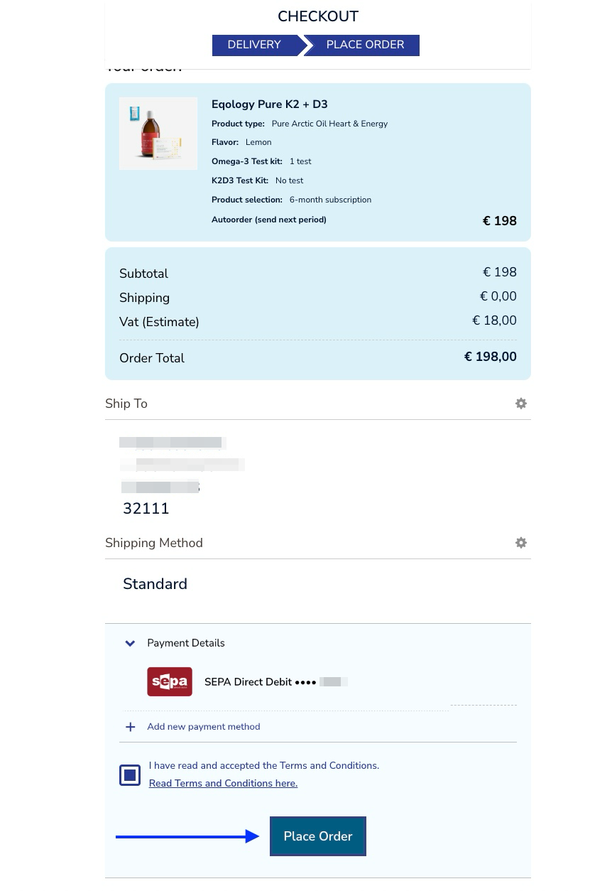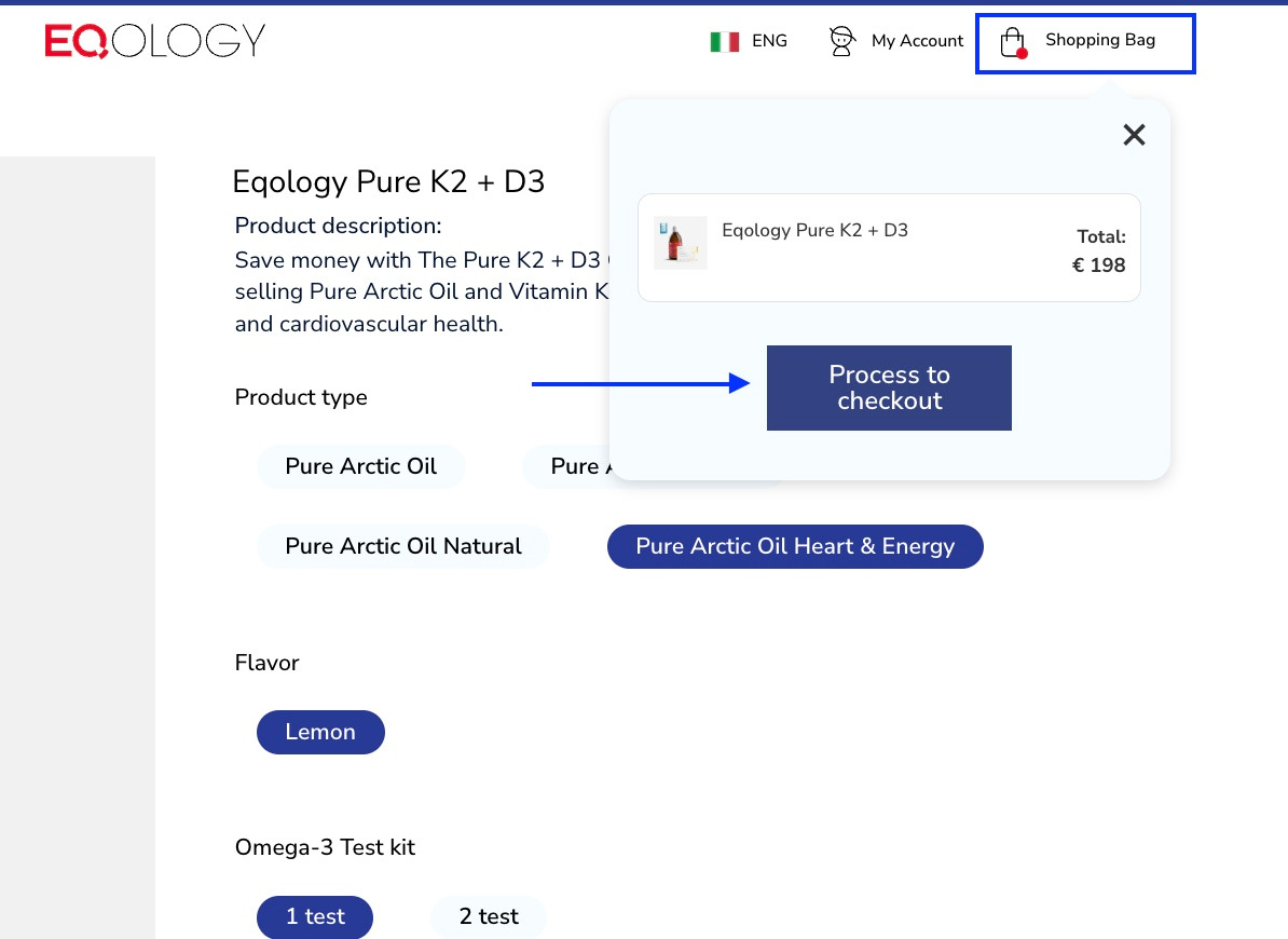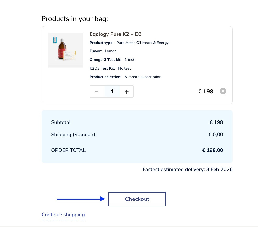 On the right you can choose from different oil types. You also may order a K2+D3 test if you wish. Let’s order Pure Arctic Oil Heart and Energy with Omega 3 test but without K2+D3 test.