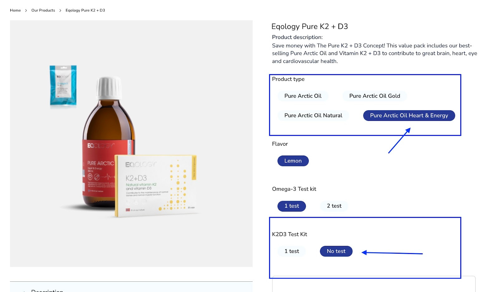 Firstly click on -Pure Arctic Oil Heart&Energy in the product type. Then navigate to K2D3 test and click on -no test.