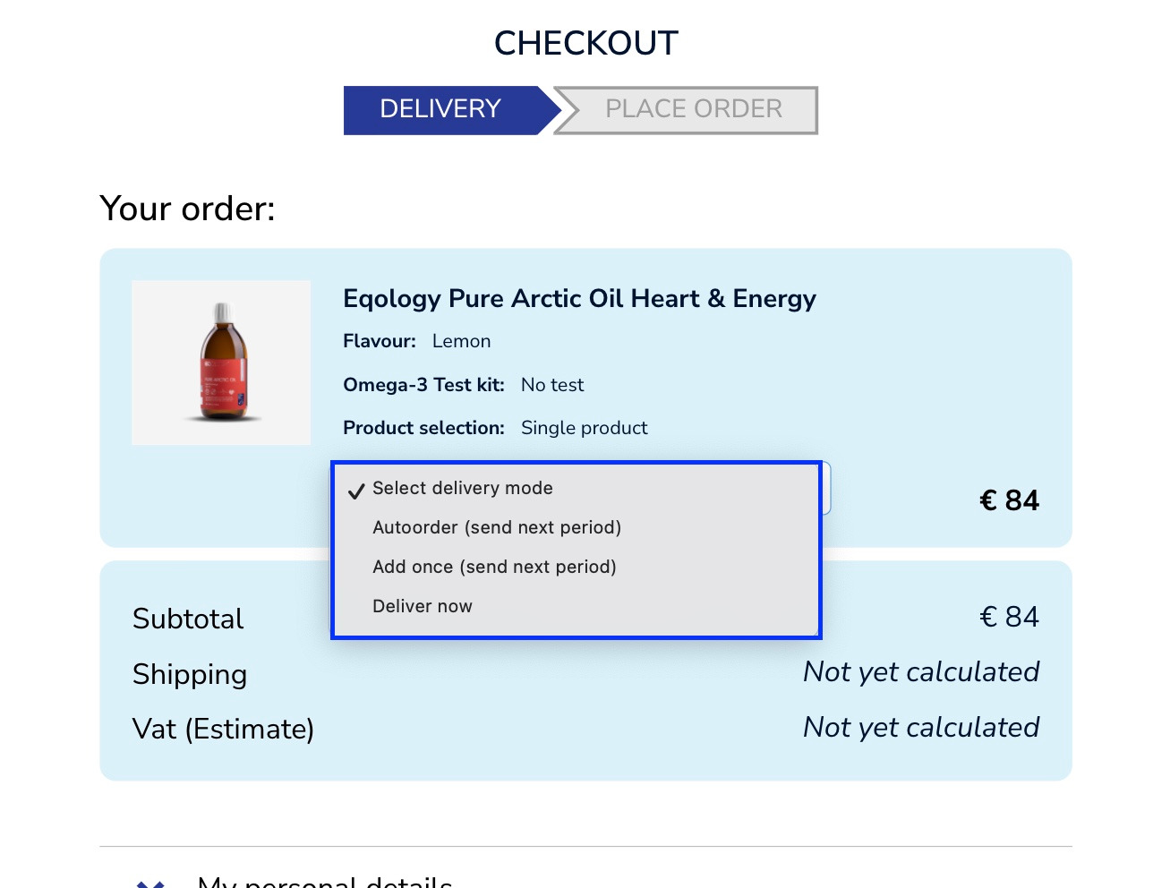 Only one option pops up, because it is a subscription, you will receive this product monthly. If you wish to receive it faster and you’ve got other products in your Auto-order see here on how to do it (How to process auto-order directly?)
