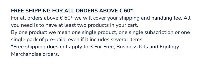 If you order at least two single products for the amount of 60 euro, you will receive a free shipment. By one product we mean one single product, one single subscription or one single pack of pre-paid, even if it includes several items.
