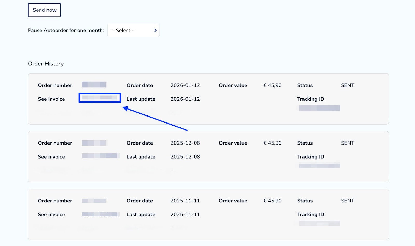 Find an order that you would like to get the invoice from and then click on -See invoice.