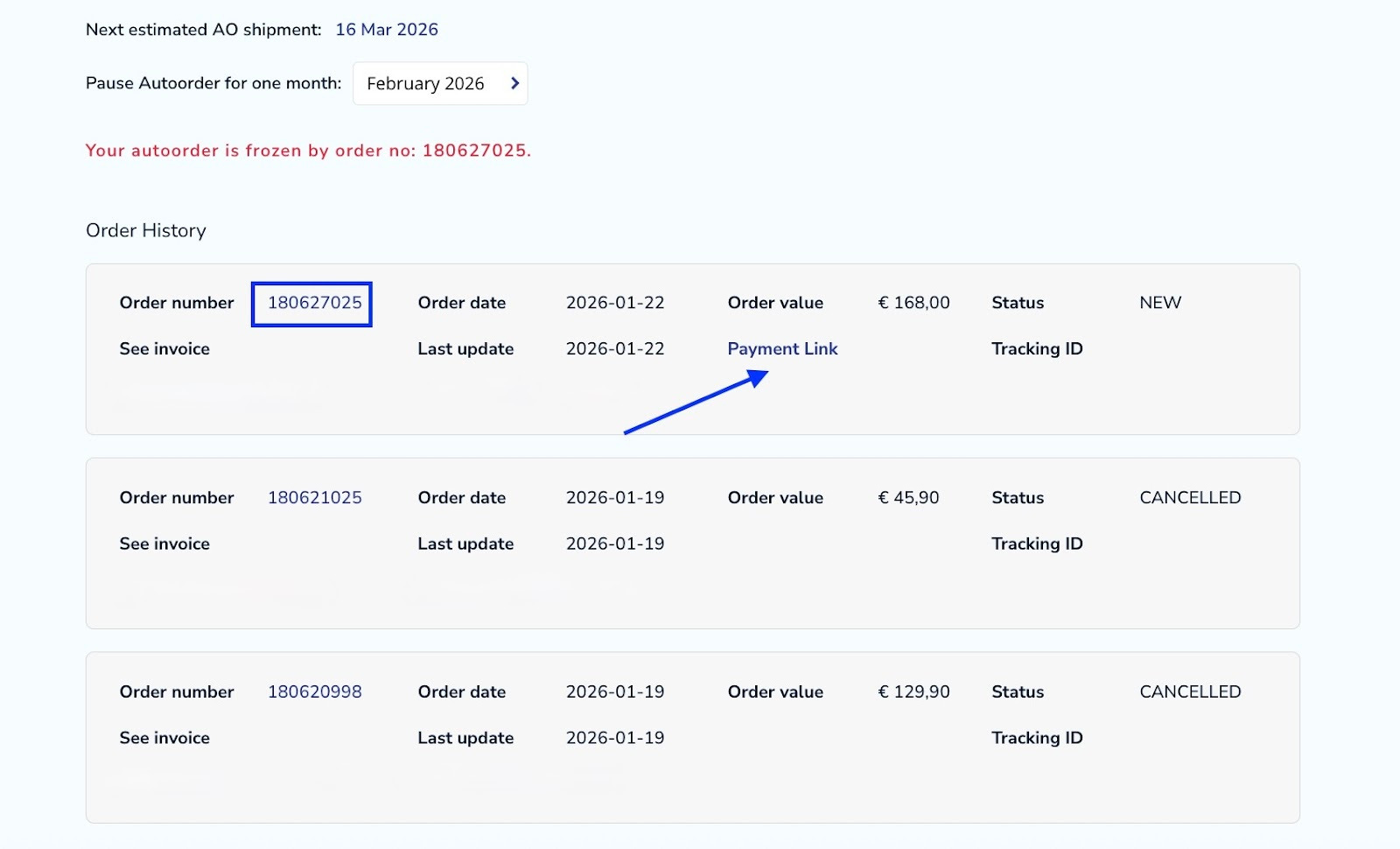 If your monthly order has been processed but hasn’t been paid yet, your autoorder stays frozen. You can find it in the section -my account - my orders. Take a look here: