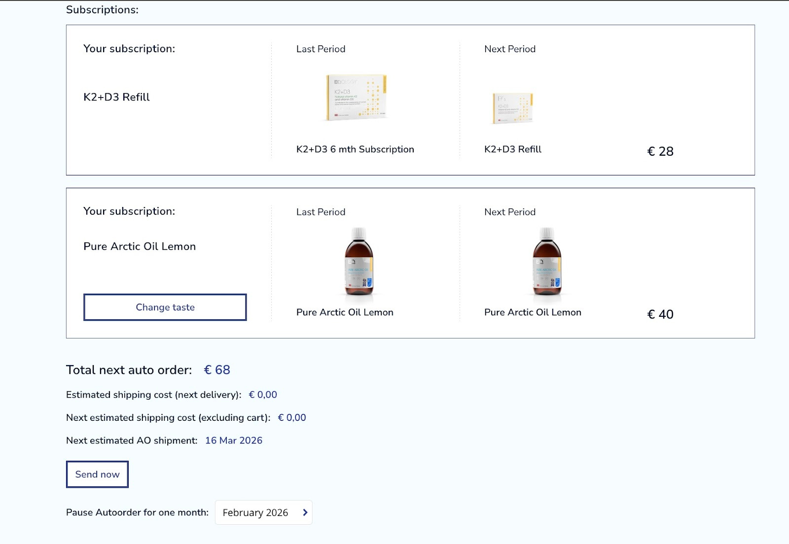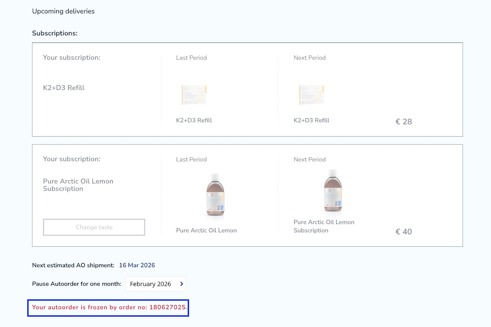 The tab with your subscriptions is also grayed out. You can find a statement there saying that your autoorder is frozen by order number…