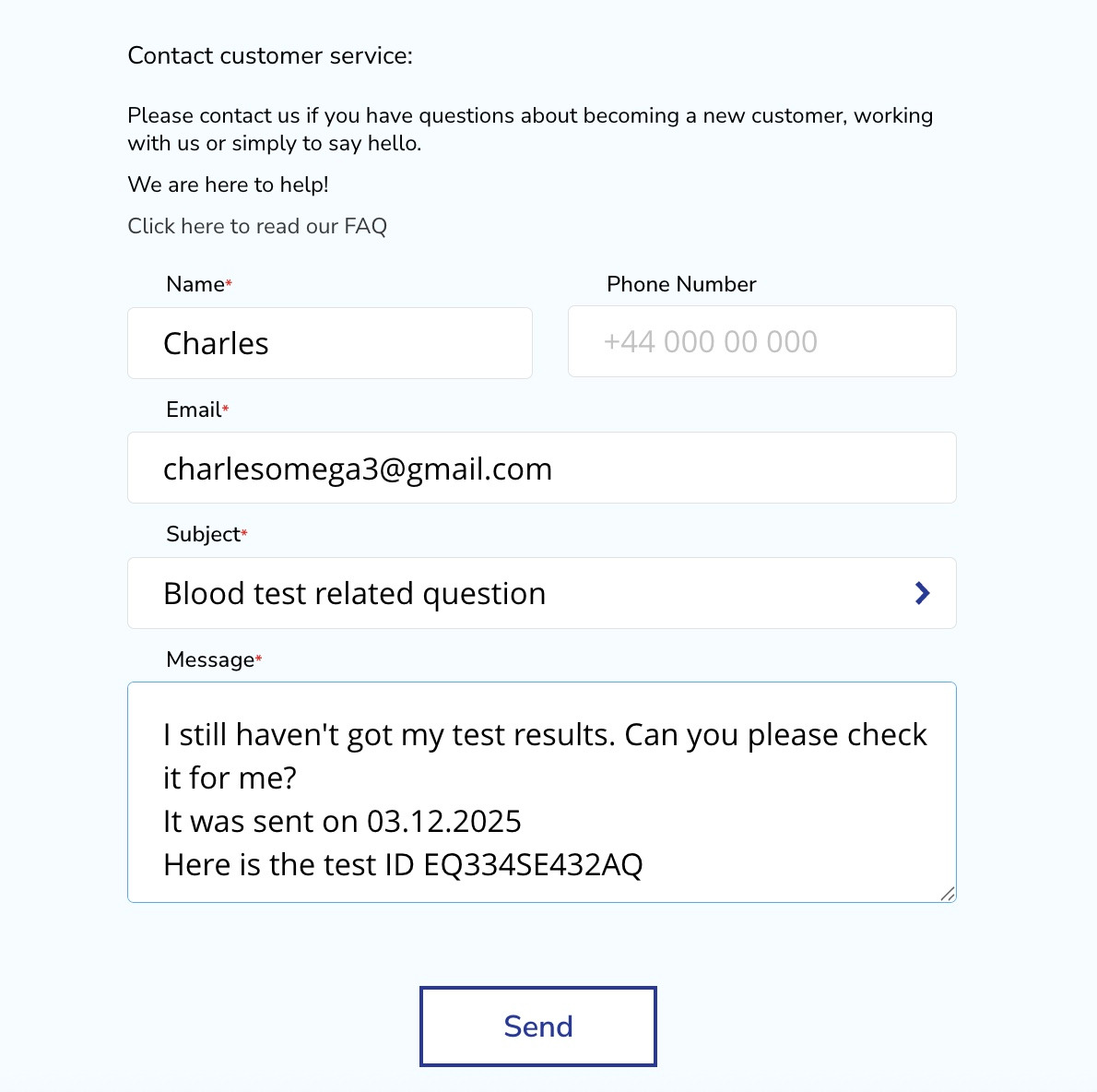 When you are ready, just click on the send button. You will hear from our Support Team as soon as we find out what happened with your results.