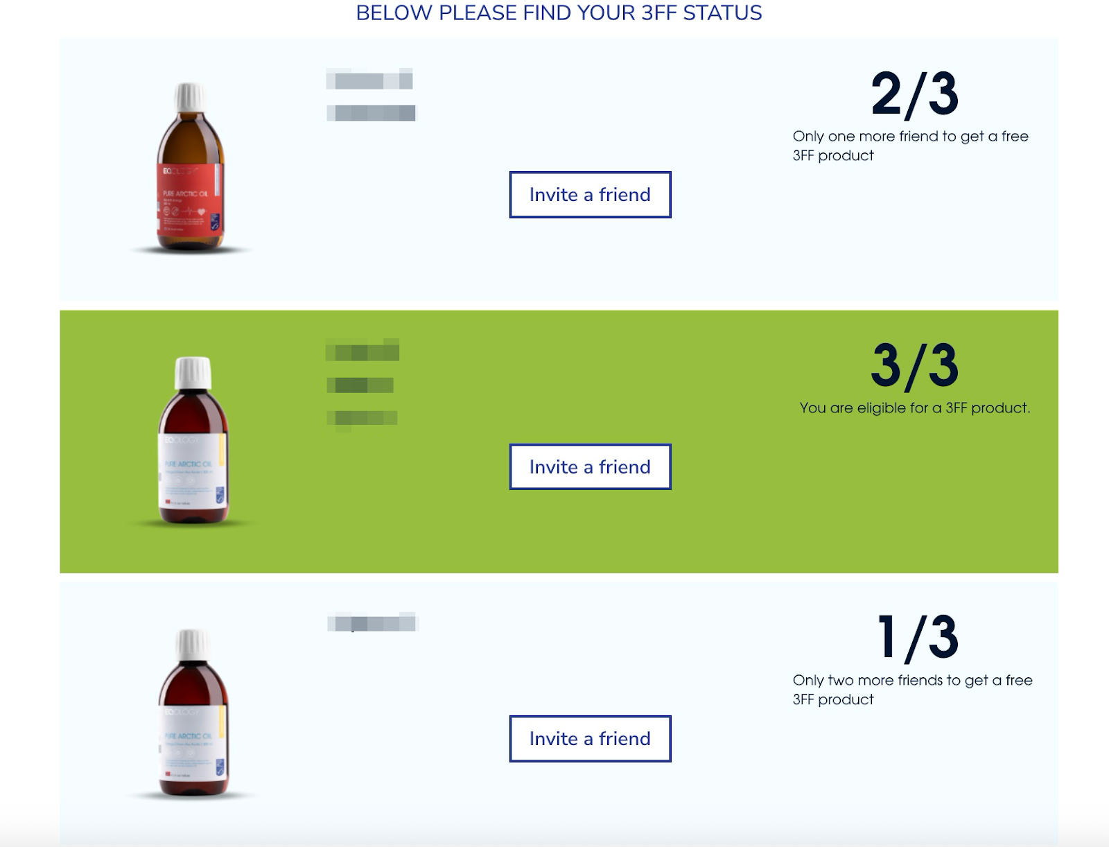 3FF monthly runs on a calendar month basis. It is important to underline that by activating your product and getting 3 customers with the same product in the same calendar month, you will receive your 3FF reward starting from the next month. For example, if you buy a bottle of Pure Arctic Oil in January and your 3 customers do the same also in January, then you will receive your bottle for free in February and you will be getting it for free as long as your customers stay active on a monthly basis.