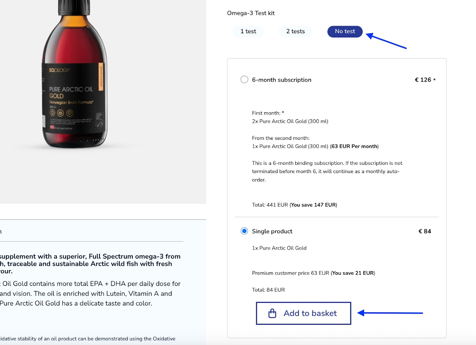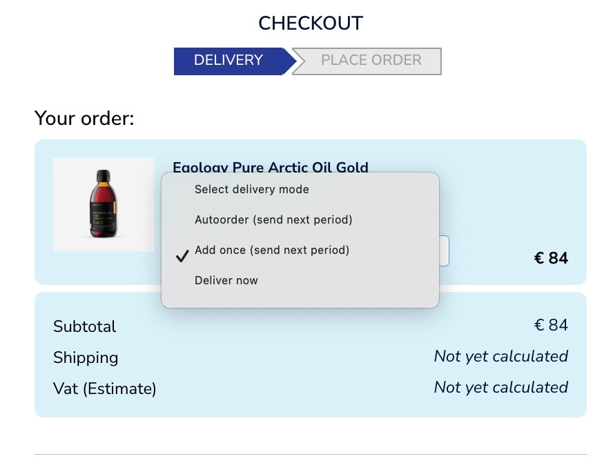 If you wish to order some extra product or products and have them sent with your following monthly delivery, you can add those items as single products to your auto-order additionally so that they will be sent only once. To do that remember to select the option -no test, only then the option of a single product will appear.