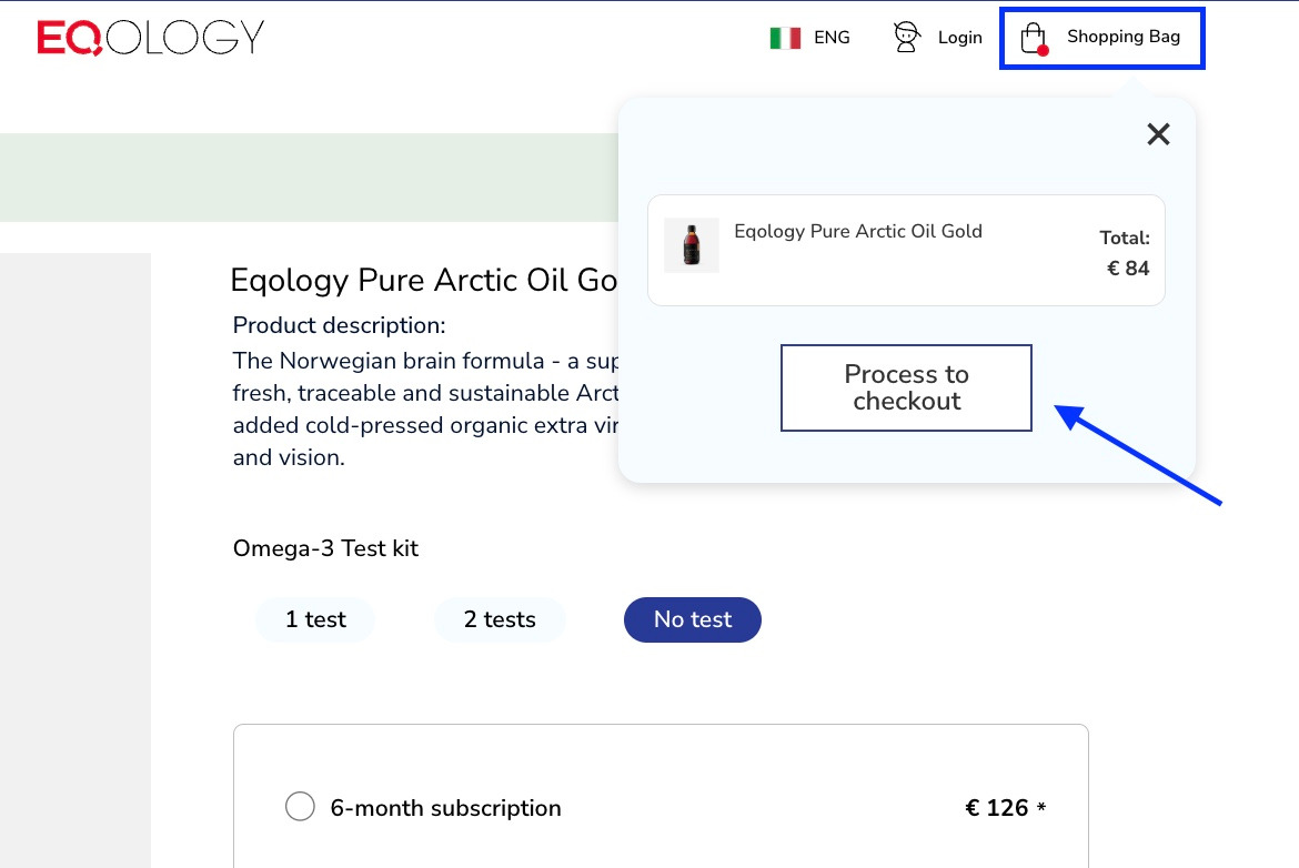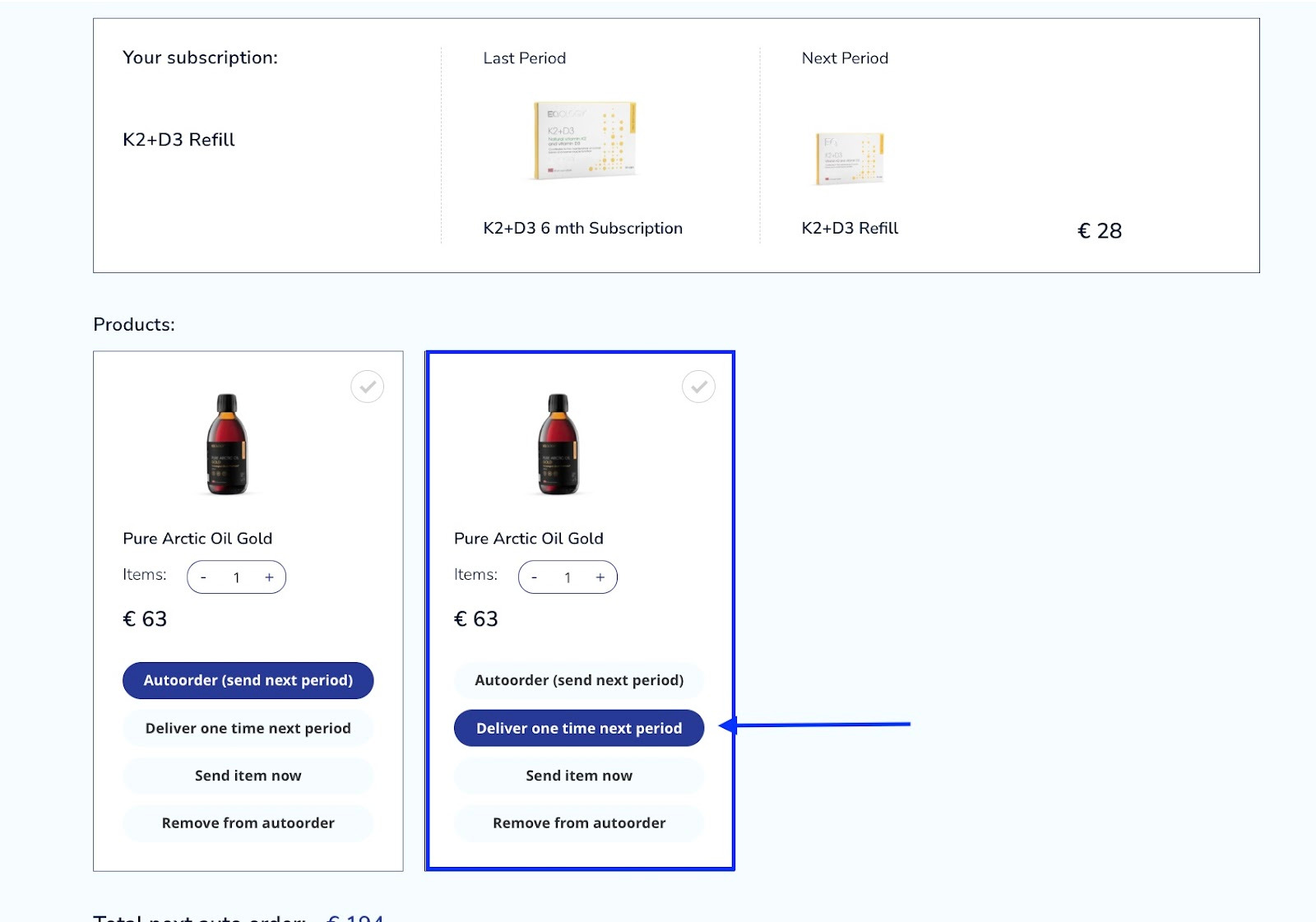 Here you can find the content of your monthly order. As you can see under the subscription tab, there is a single product Pure Arctic Oil Gold that will be sent in the next delivery.