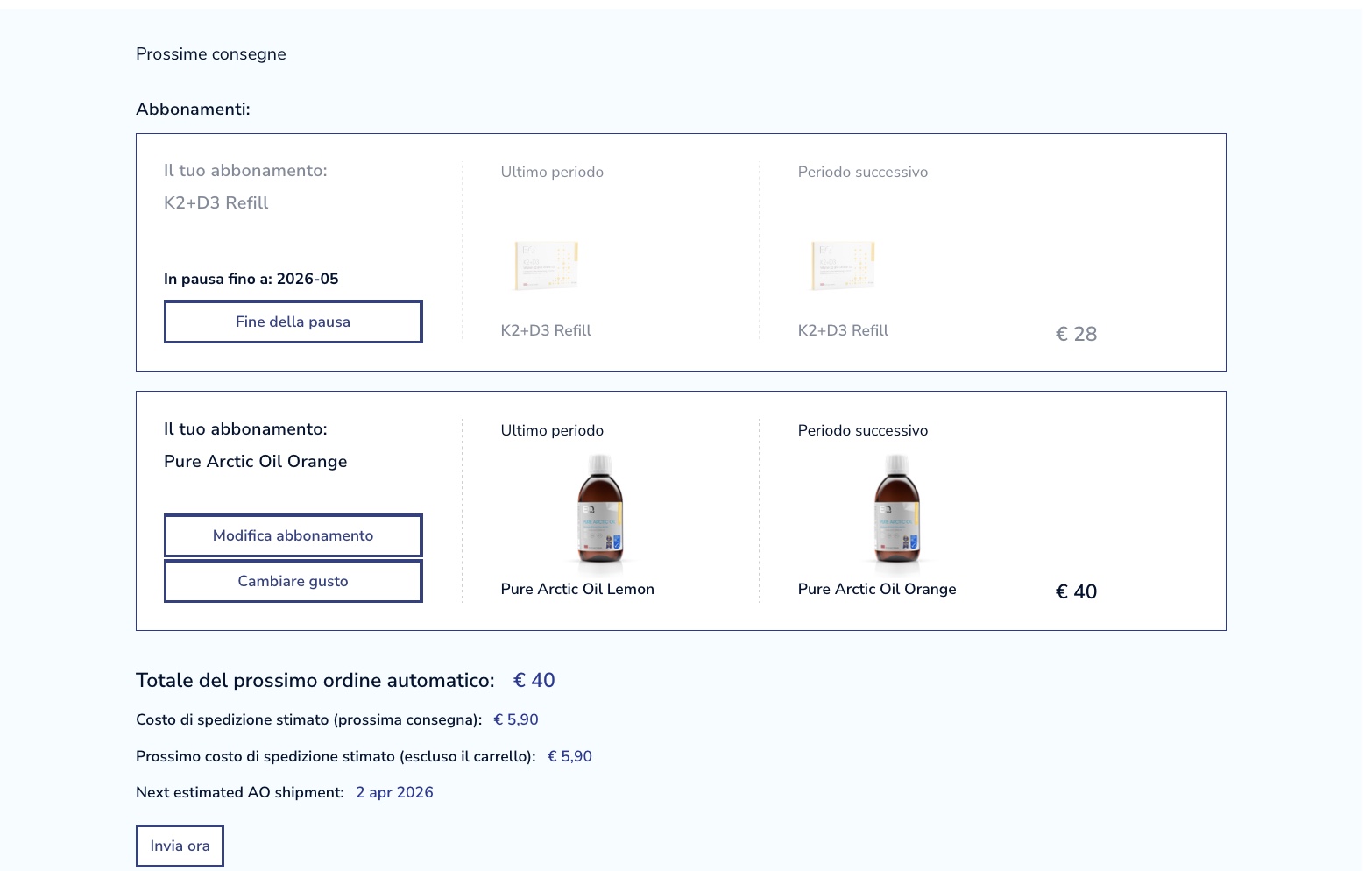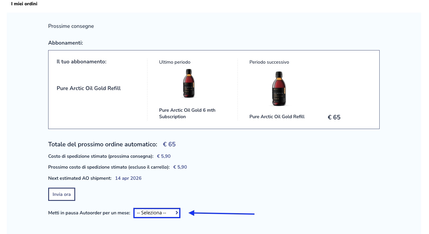 Come puoi vedere, il grafico relativo a K2+D3 viene disattivato e ricevi la conferma che il prodotto è stato messo in pausa. Il grafico relativo a Pure Arctic Oil rimane attivo, il che significa che nei prossimi due mesi riceverai solo olio di pesce.