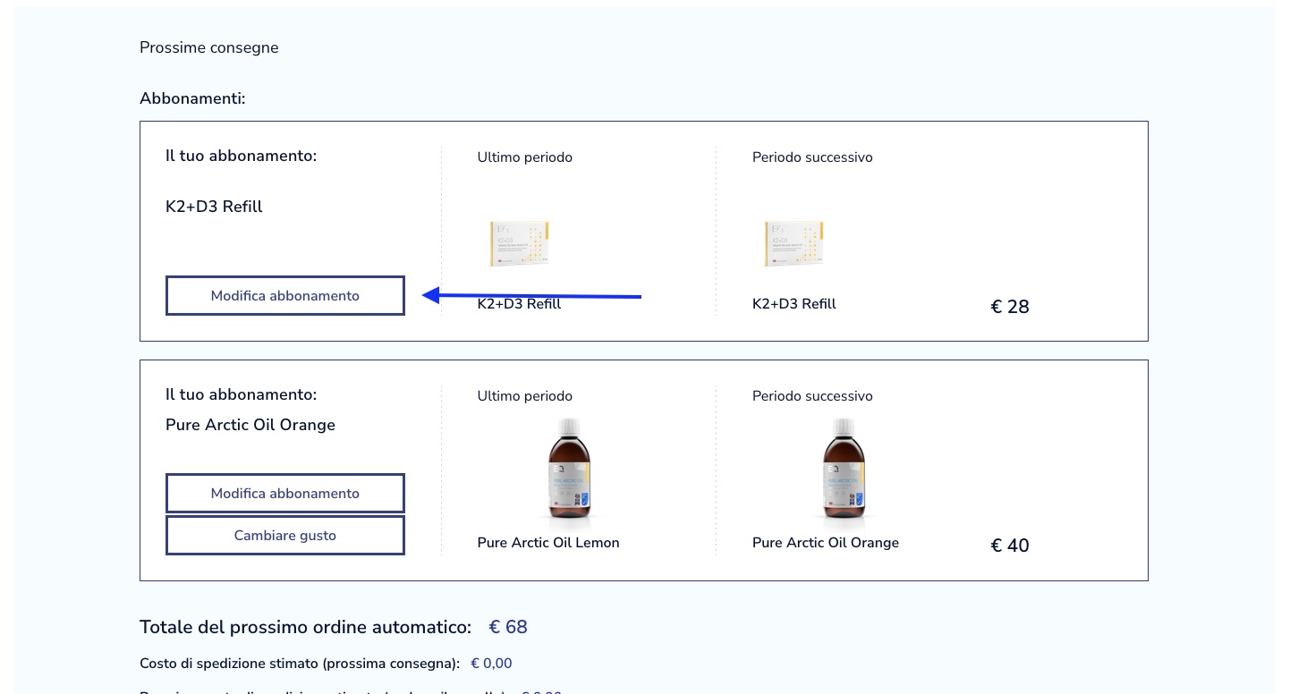 Supponiamo che tu voglia sospendere l'abbonamento a K2+D3 per 2 mesi. Basta cliccare sul pulsante “Modifica abbonamento” nella tabella degli abbonamenti a K2+D3.