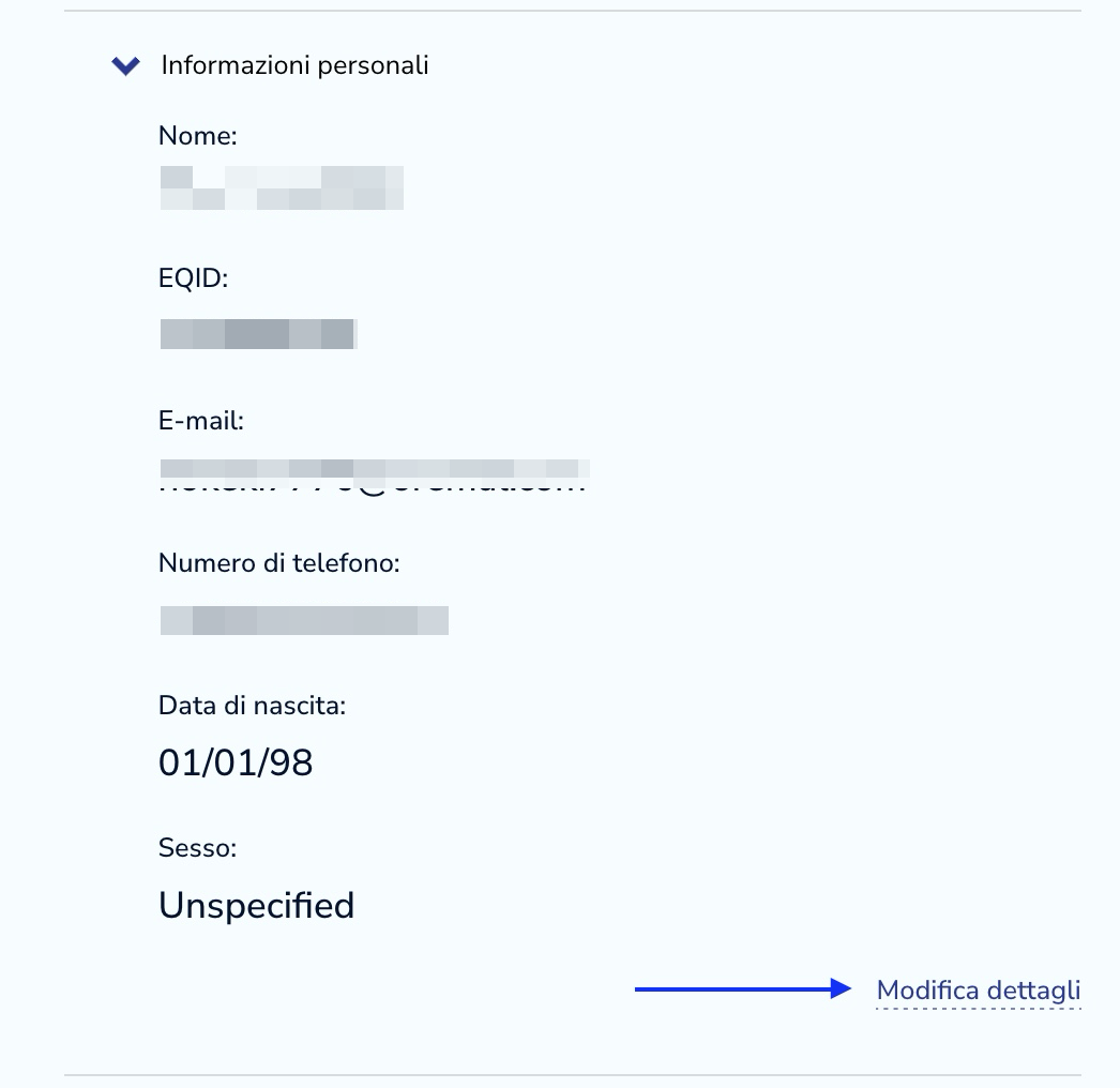 Per modificare il tuo indirizzo e-mail, devi cliccare su «Il mio account» nell'angolo in alto a destra e poi su «I miei dettagli».