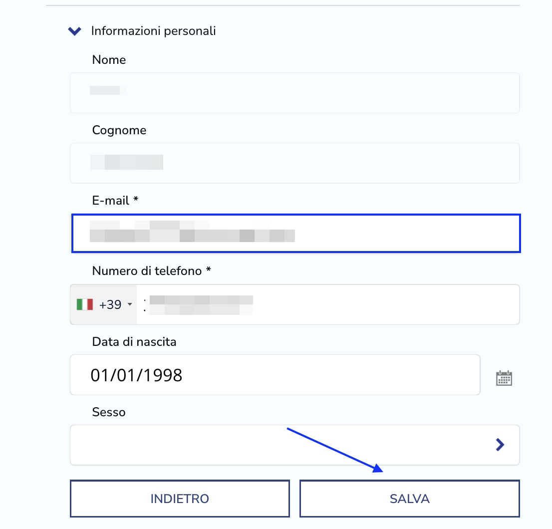 Qui puoi modificare il tuo indirizzo e-mail; una volta terminato, clicca sul pulsante «Salva».