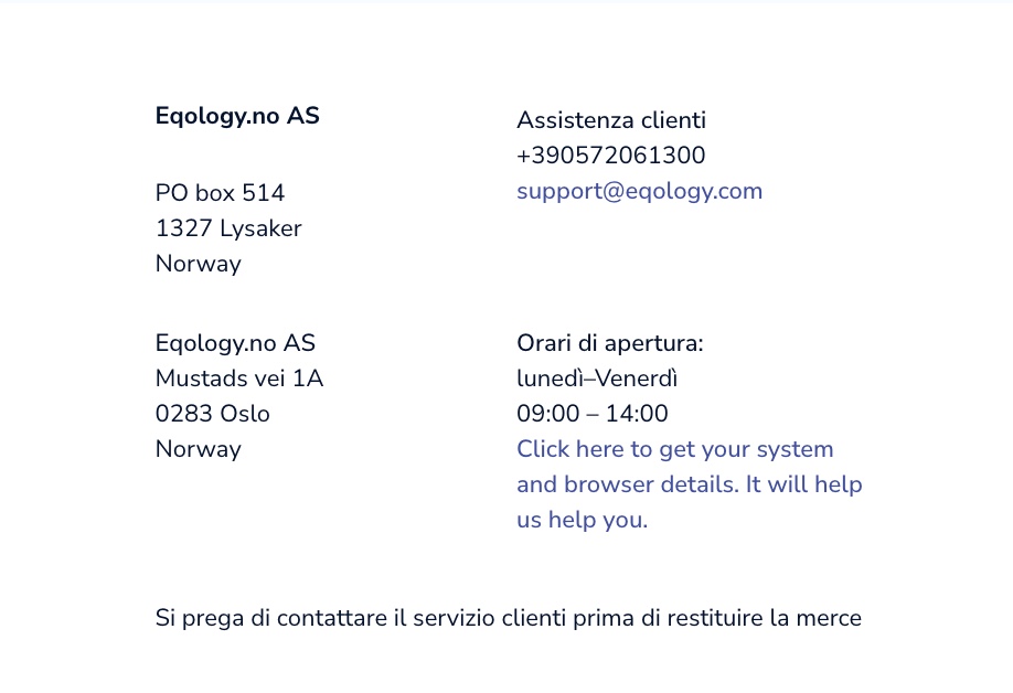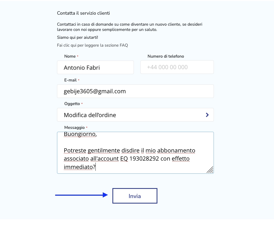 Ricordati di indicare il tuo numero EQ ID (vedi qui: Come contattare l'assistenza?)