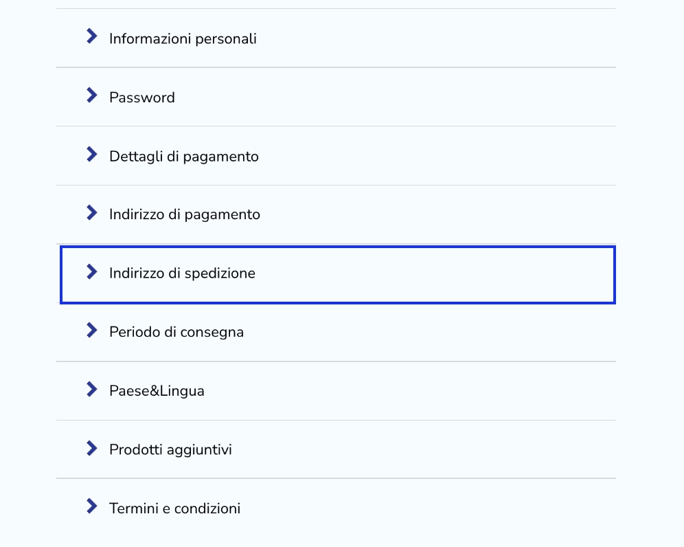 Scorri verso il basso fino a trovare la scheda “Indirizzo di spedizione” e cliccaci sopra.