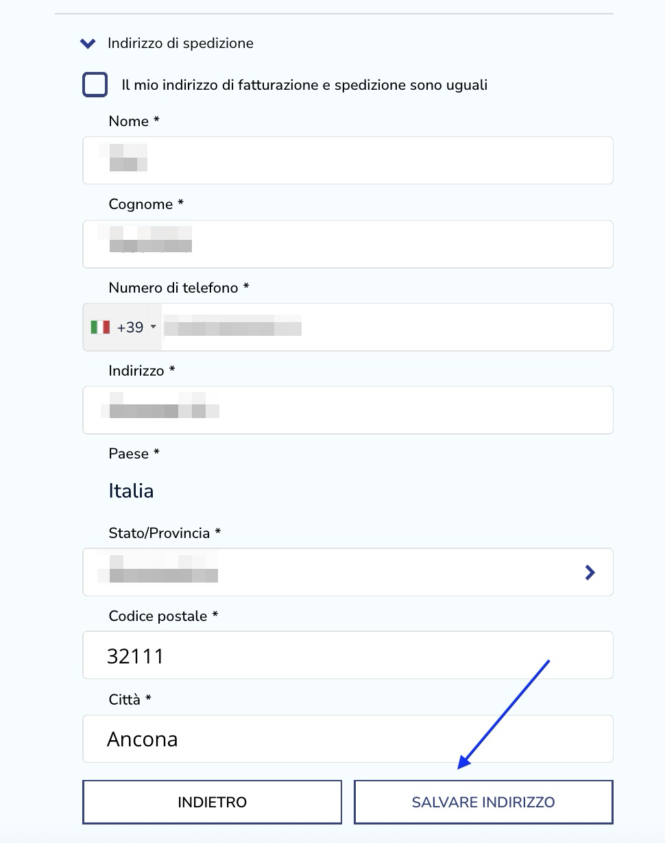 Qui troverai i campi in cui modificare tutte le informazioni necessarie. Quando hai finito, clicca sul pulsante «Salvare indirizzo».