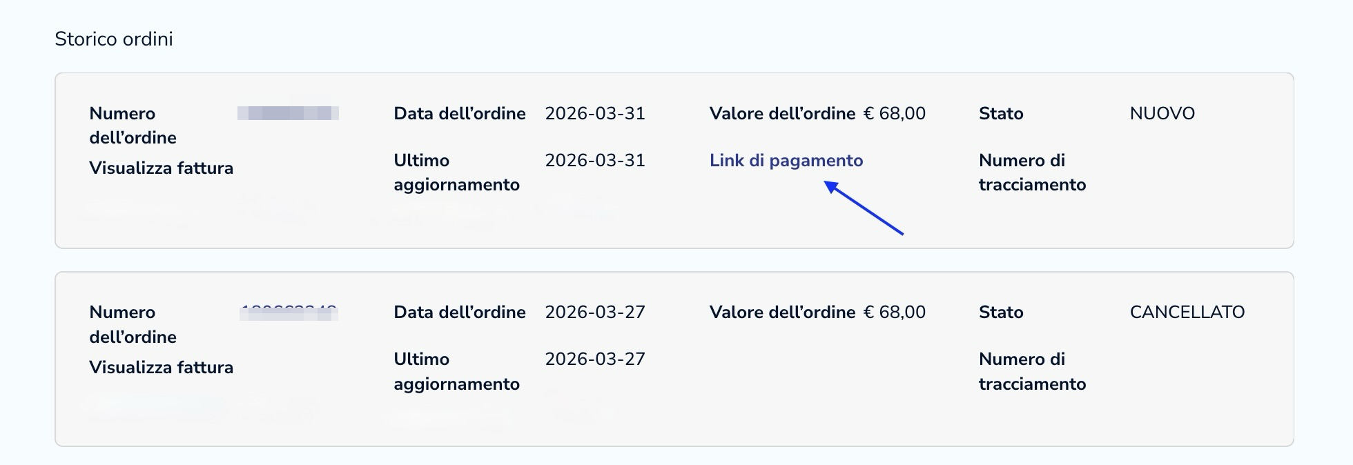Scorri verso il basso fino alla cronologia degli ordini e individua il tuo ultimo ordine. Si tratta dell'ordine con lo stato «NUOVO», il che significa che non è ancora stato pagato. A questo punto, clicca sul link per il pagamento.
