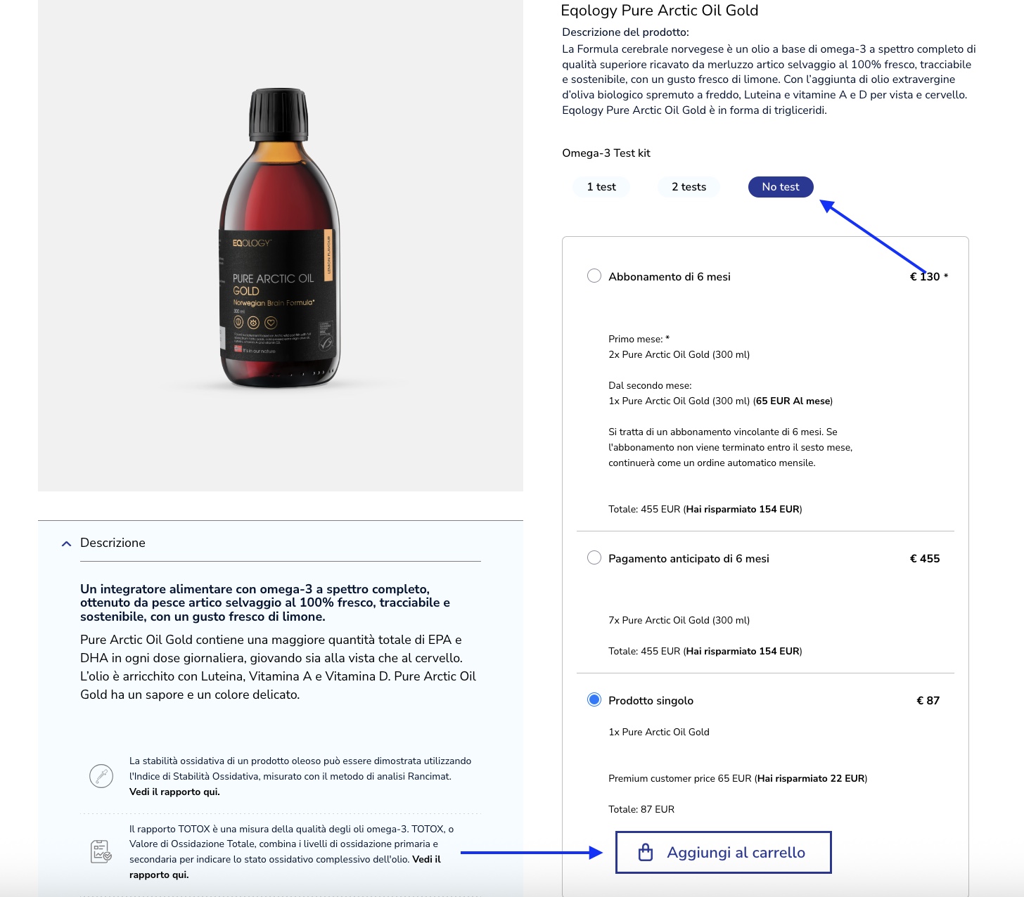 Se desideri ordinare uno o più prodotti aggiuntivi e riceverli insieme alla tua prossima consegna mensile, puoi aggiungere tali articoli come prodotti singoli al tuo ordine automatico, in modo che vengano spediti una sola volta. Per farlo, ricordati di selezionare l'opzione «-no test»; solo allora apparirà l'opzione relativa al prodotto singolo.