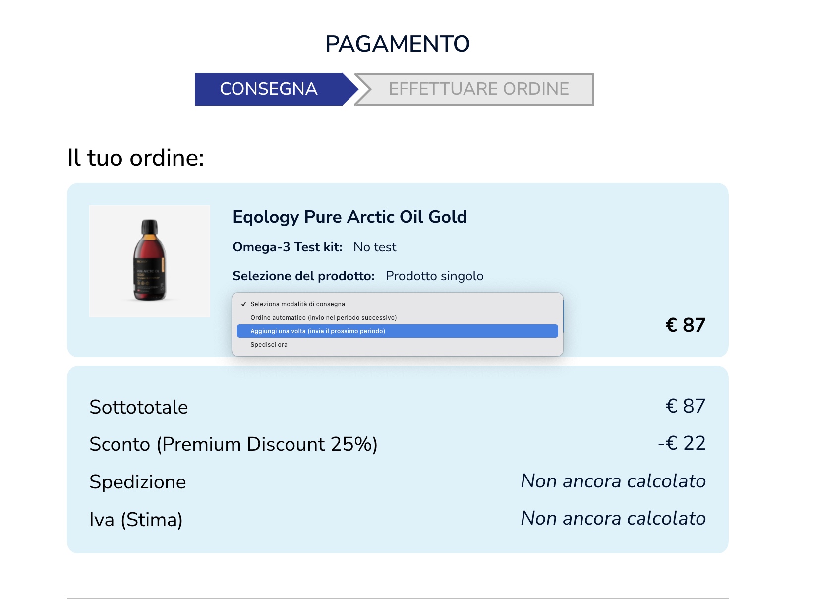 Ora puoi scegliere il metodo di consegna; se desideri ricevere la consegna una sola volta insieme alla tua prossima spedizione mensile, seleziona l'opzione «Aggiungi una volta».