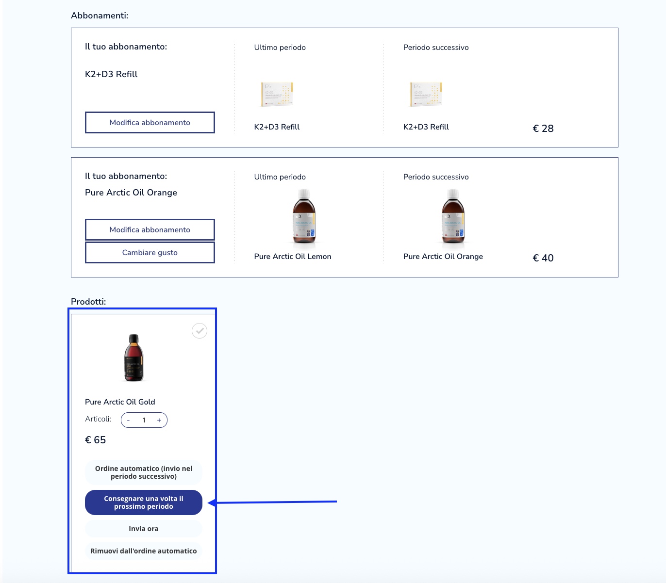 Qui puoi trovare il contenuto del tuo ordine mensile. Come puoi vedere nella scheda “Abbonamento”, nella prossima consegna ti verrà inviato un prodotto: Pure Arctic Oil Gold.